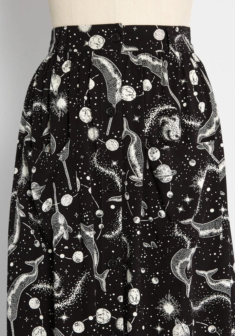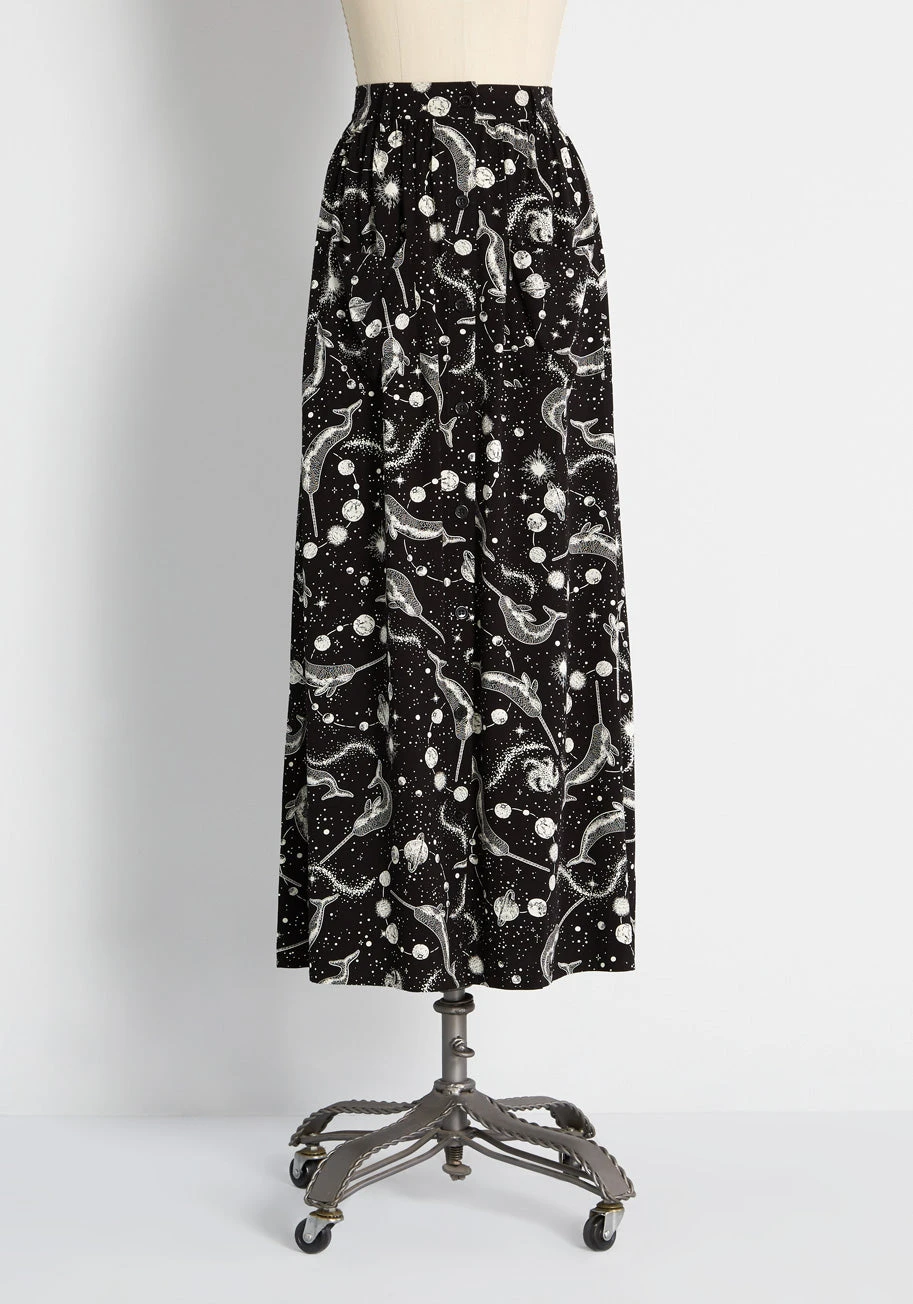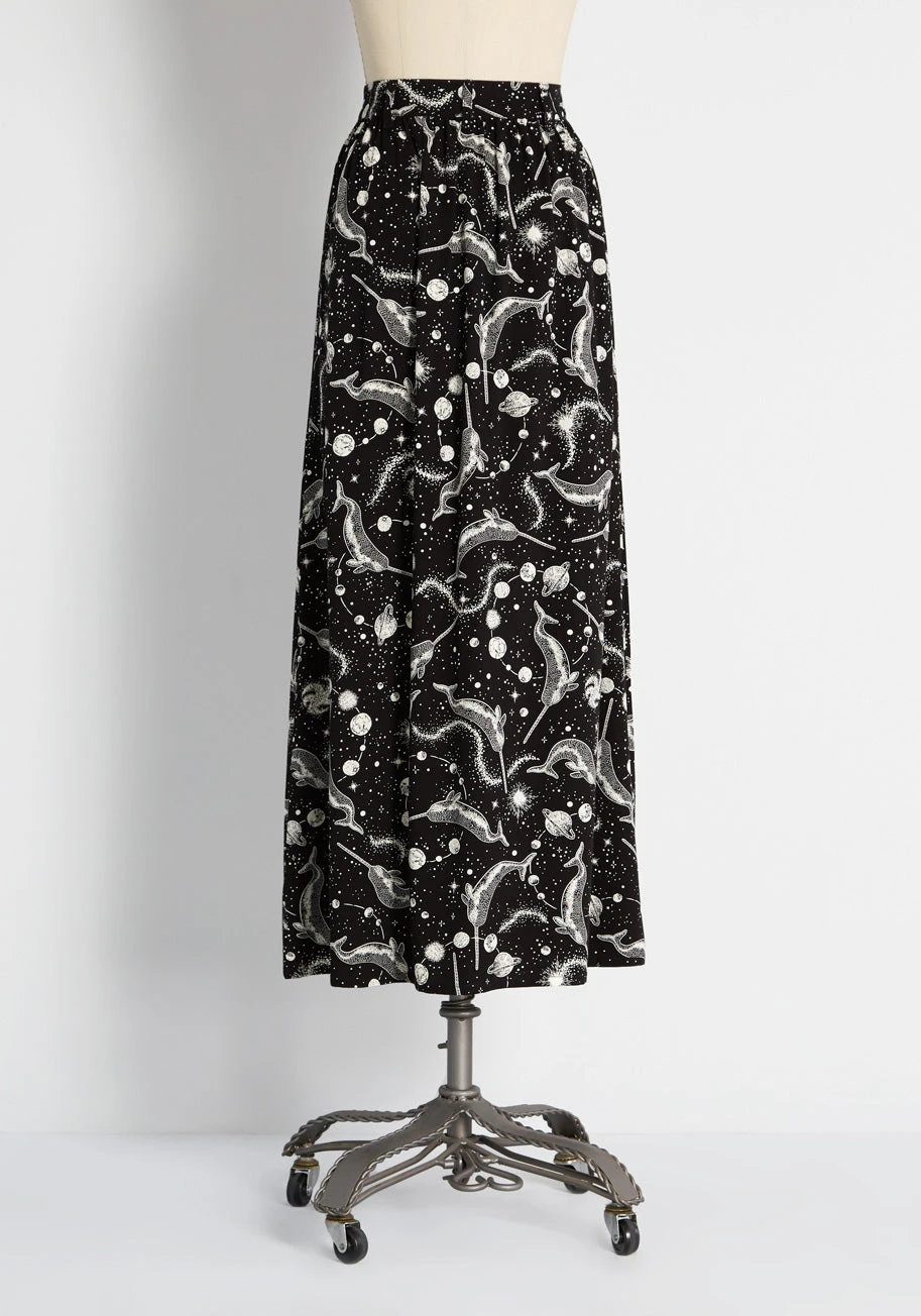 Dive into the stylish deep end when you rock this under-the-sea meets space themed maxi skirt by Aussie brand Dangerfield. Unmatched in its unique print, this full-length skirt is made from a flowy, black viscose fabric that looks as luxe as it feels. Boasting an extremely intricate and quirky print made-up of vintage-inspired narwhal and outer space illustrations in white, this separate is sure to make some charming, galactic waves no matter what you wear it with. Featuring subtle shirring at the waist, side pockets, and a full button-front closure, this magically printed, high-waisted bottom is a flattering and versatile piece to take you into spring and beyond.