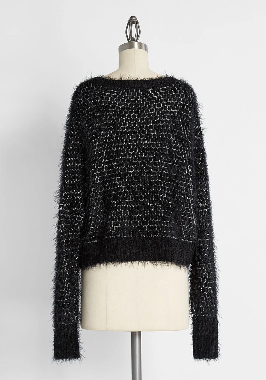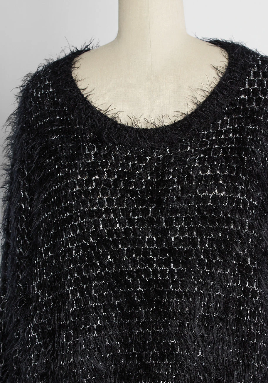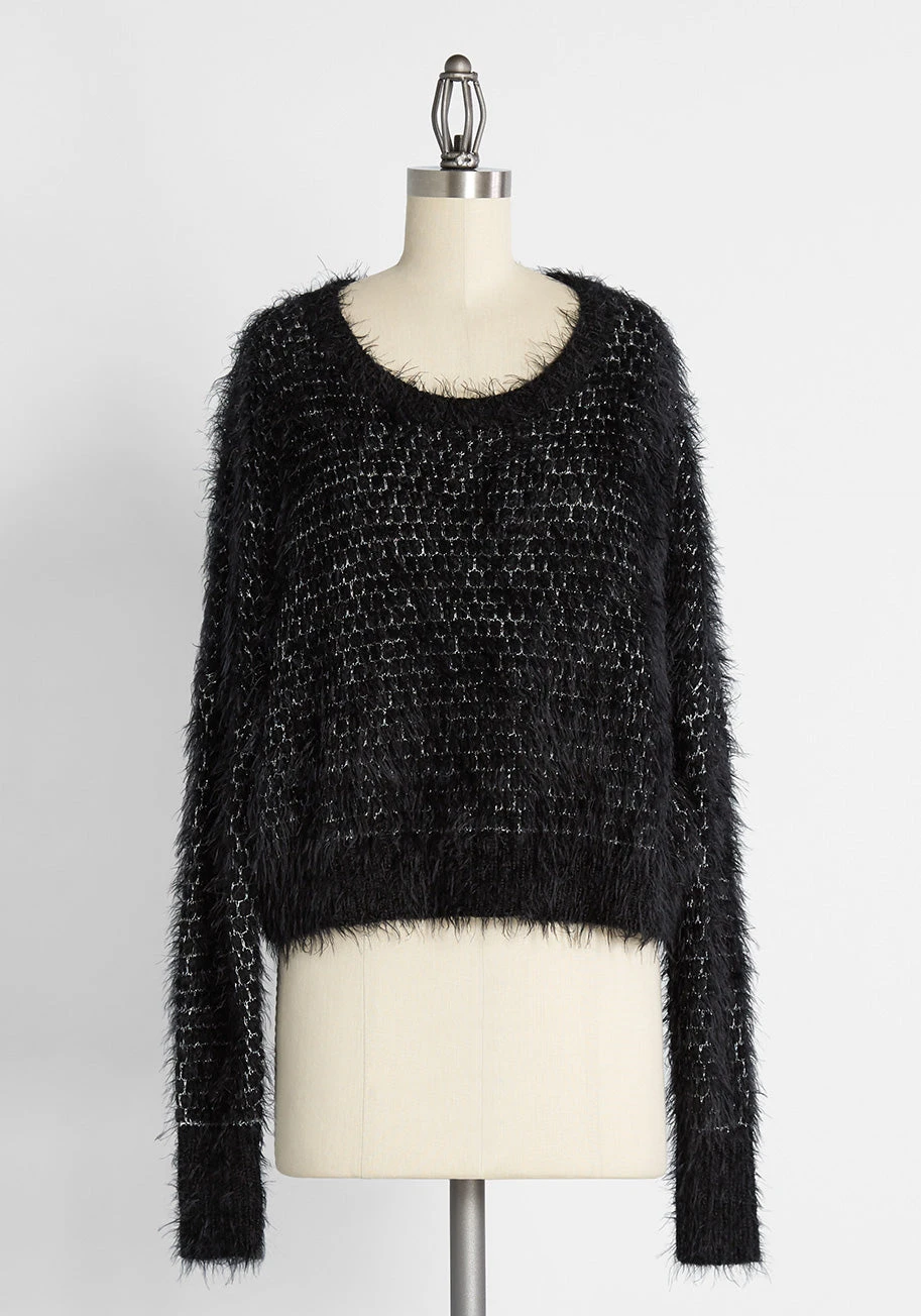 Even the frigid days call for stylish foundations. So conquer the chill confidently with this black eyelash knit sweater from our ModCloth namesake label. Made of an eyelash knit with metallic silver detailing, this crewneck style is set up with an of-the-moment cropped, oversized fit. Style this sweater with a slip skirt, tights, and your favorite ankle boots.