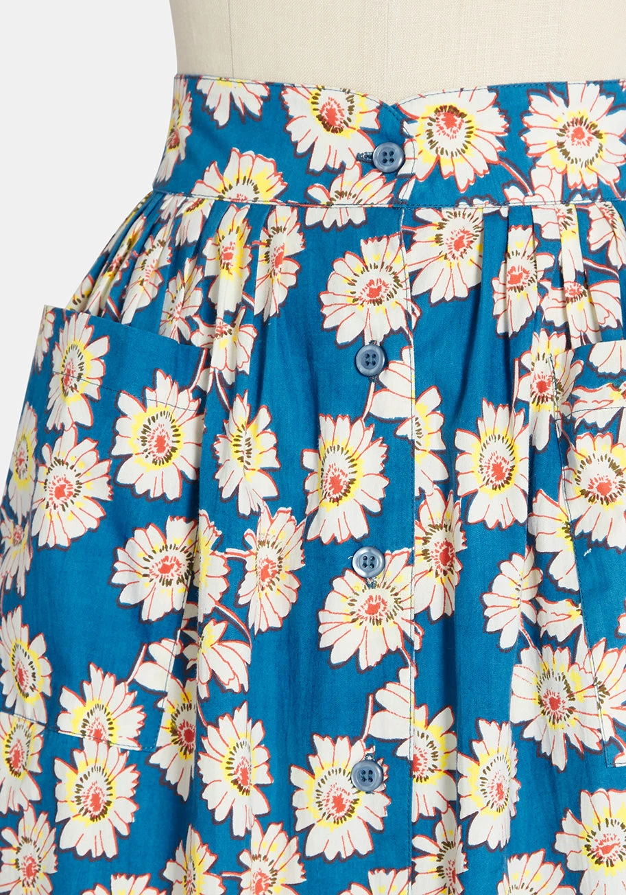 Craving a weekend of blue skies? We have the blue floral skirt to take you there. Featuring buttons that trail from waist to hem, this skirt is spotted with yellow daisies atop a brilliant blue background. Stash your phone or keys in the handy pocket that flack each hip. So, get dressed and take on the sun soaked afternoon!
