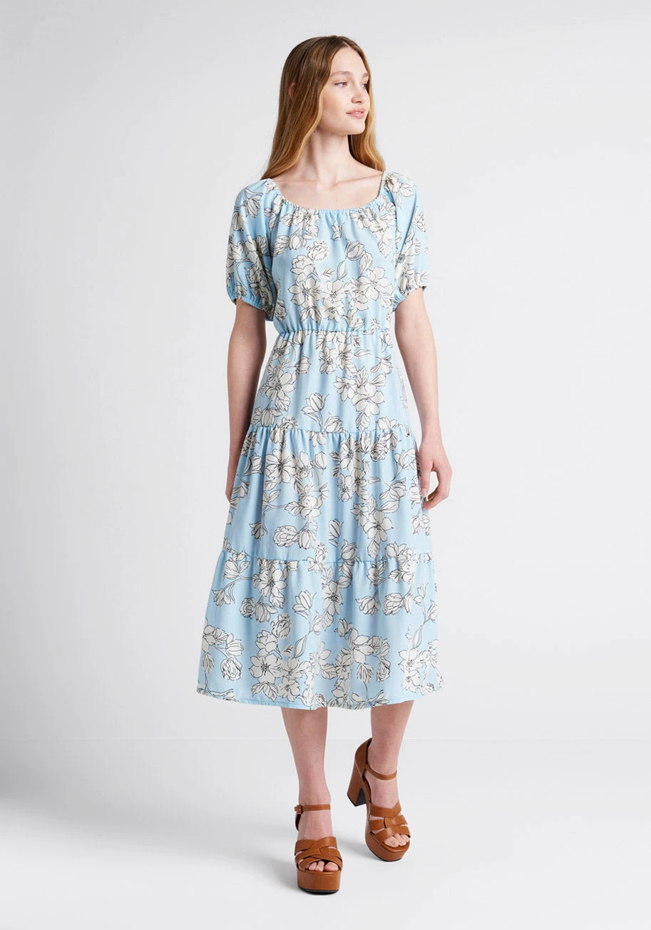 For simple-yet-sublime summer styling, slip into this delightfully cottagecore dress from Parker And Rowe! Made from a gauzy, powder blue woven fabric with an all-over, ivory and black-sketched floral print, this lightweight midi dress boasts short sleeves with elasticized cuffs, an elasticized scoop neckline that adds gathered detailing and the option to create an over-the-shoulder look, a gathered high-rise waist that gives way to a boho-chic tiered midi skirt.