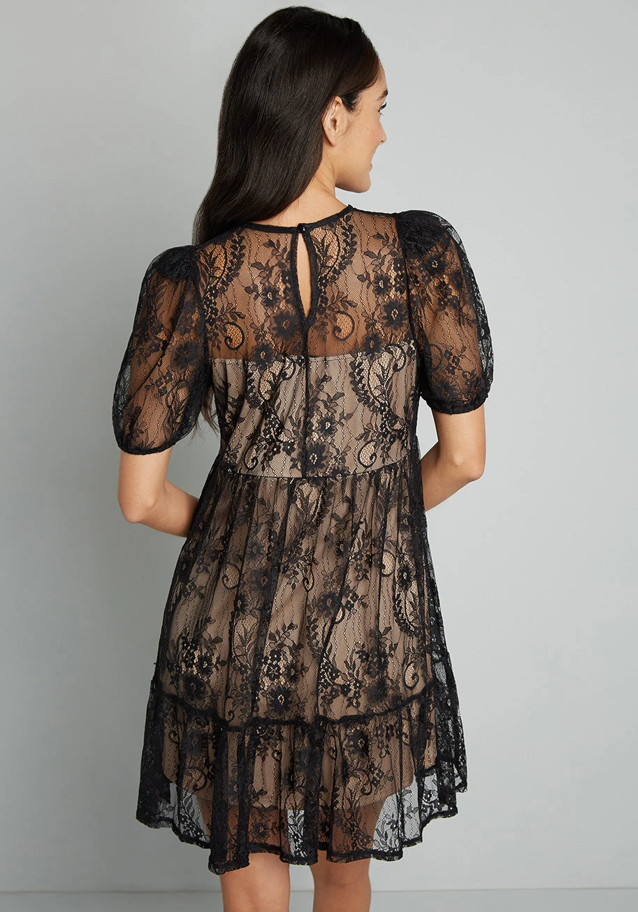 Dare to make them do a double-take in this stunningly sheer black lace party dress! Made from a delicate black lace overlay with a beautiful floral pattern throughout and a contrasting cream-hued lining, this elegant babydoll dress boasts a round neckline with keyhole and button-loop closure at the back, sheer puff sleeves, shirring at the empire waist, a retro-chic relaxed fit, and a tiered hemline.