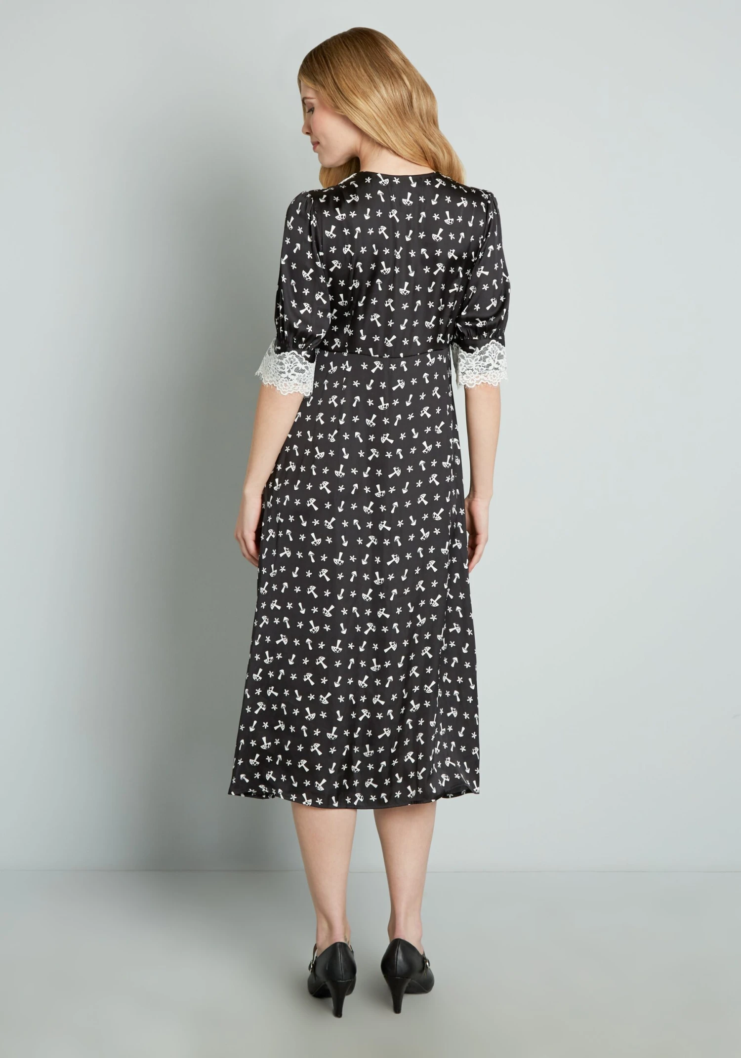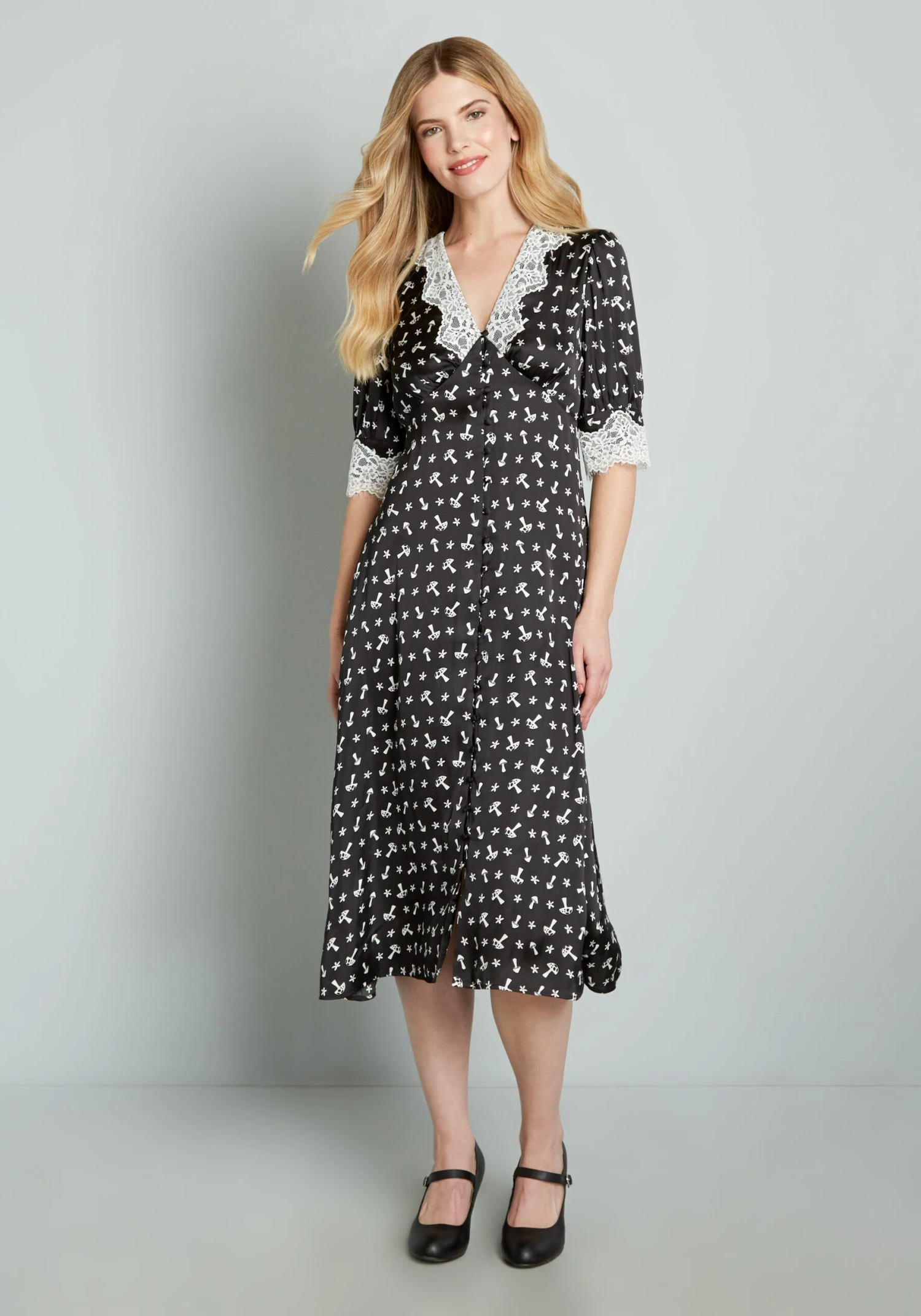 Vintage-inspired and covered throughout in an adorable hand-drawn print of white mini mushrooms and micro-blooms atop a contrasting black background, this beautifully enchanting midi dress from our ModCloth namesake label is anything but basic. Made from a recycled black chiffon, this semi-fitted frock boasts front button closure, a V-neckline with white lace trim, short blouson sleeves with white lace detailing at the cuffs, and subtle shirring at the bustline. Perfect for lounging in luxury, this whimsical house dress is truly unique.