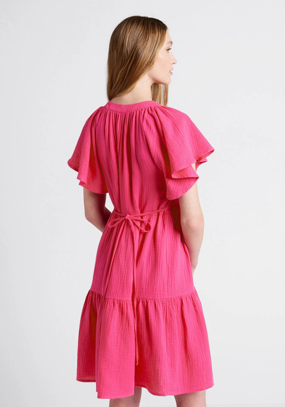 Such a lightweight and carefree summer style, this vintage-inspired sundress from Parker and Rowe is sure to become a go-to in your warm-weather collection. Made from gauzy woven cotton in a vibrant fuschia pink hue, this cottagecore dress boasts fluttery batwing sleeves, a stylish V-neckline, a gathered high-rise waist at the relaxed-fit bodice, a waist-cinching tie-string design at the back, and a single-tiered knee-length skirt.