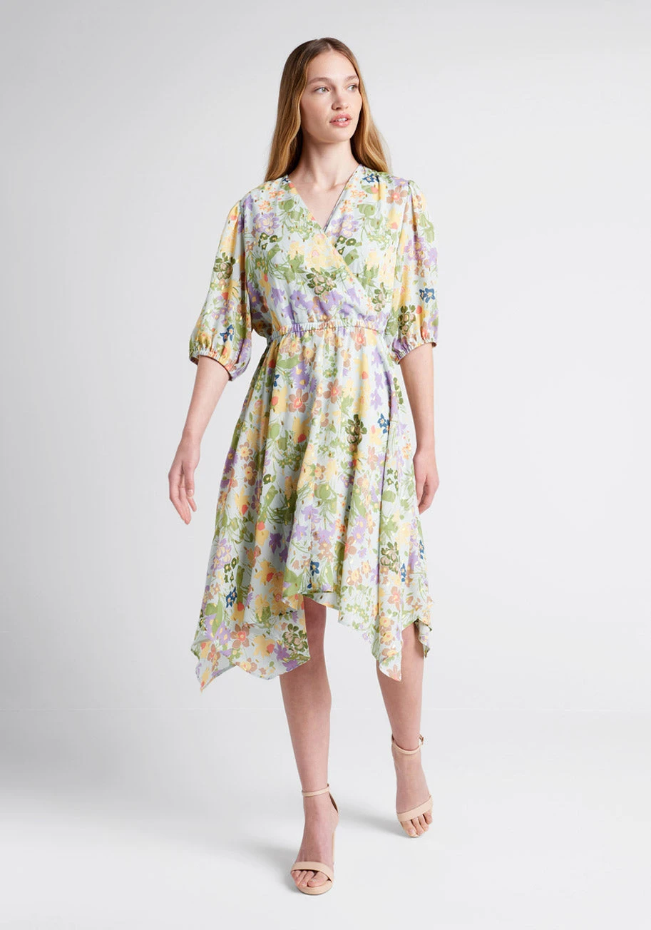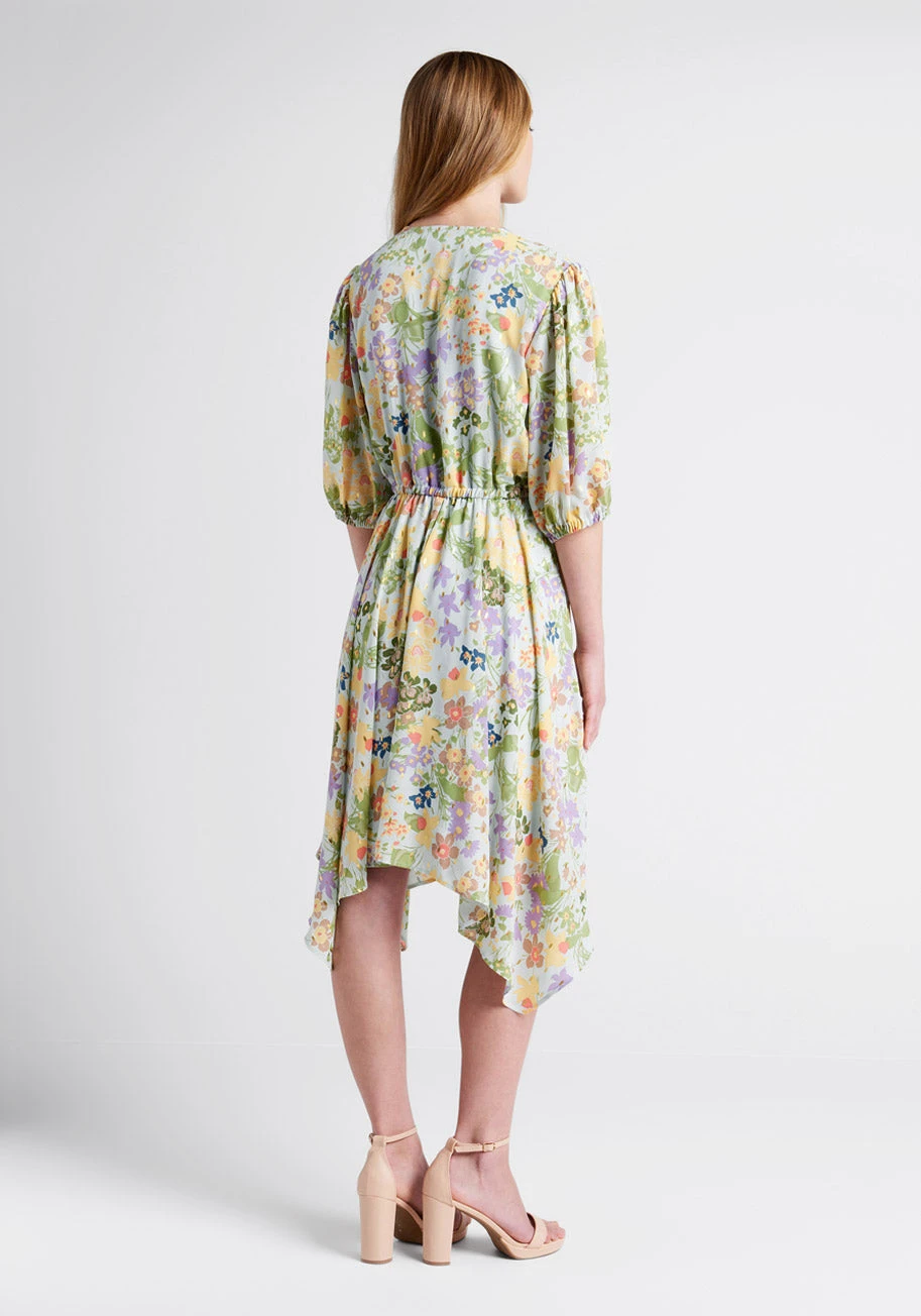 An elevated way to enjoy a sunny day, this vintage-inspired dress from Parker and Rowe is covered throughout in a bountiful burst of leafy flowers in pastels hues of lavender, orange, and yellow atop a powder blue-green hue. Made from a lightweight, crepey woven fabric bespeckled with splatters of metallic gold, this knee-length dress boasts elbow-length sleeves with elasticized cuffs, a stylish surplice neckline, and an elasticized empire waist that gives way to a flowy gathered skirt with an elegant handkerchief hemline.