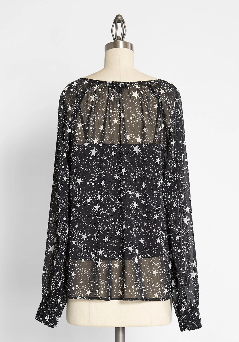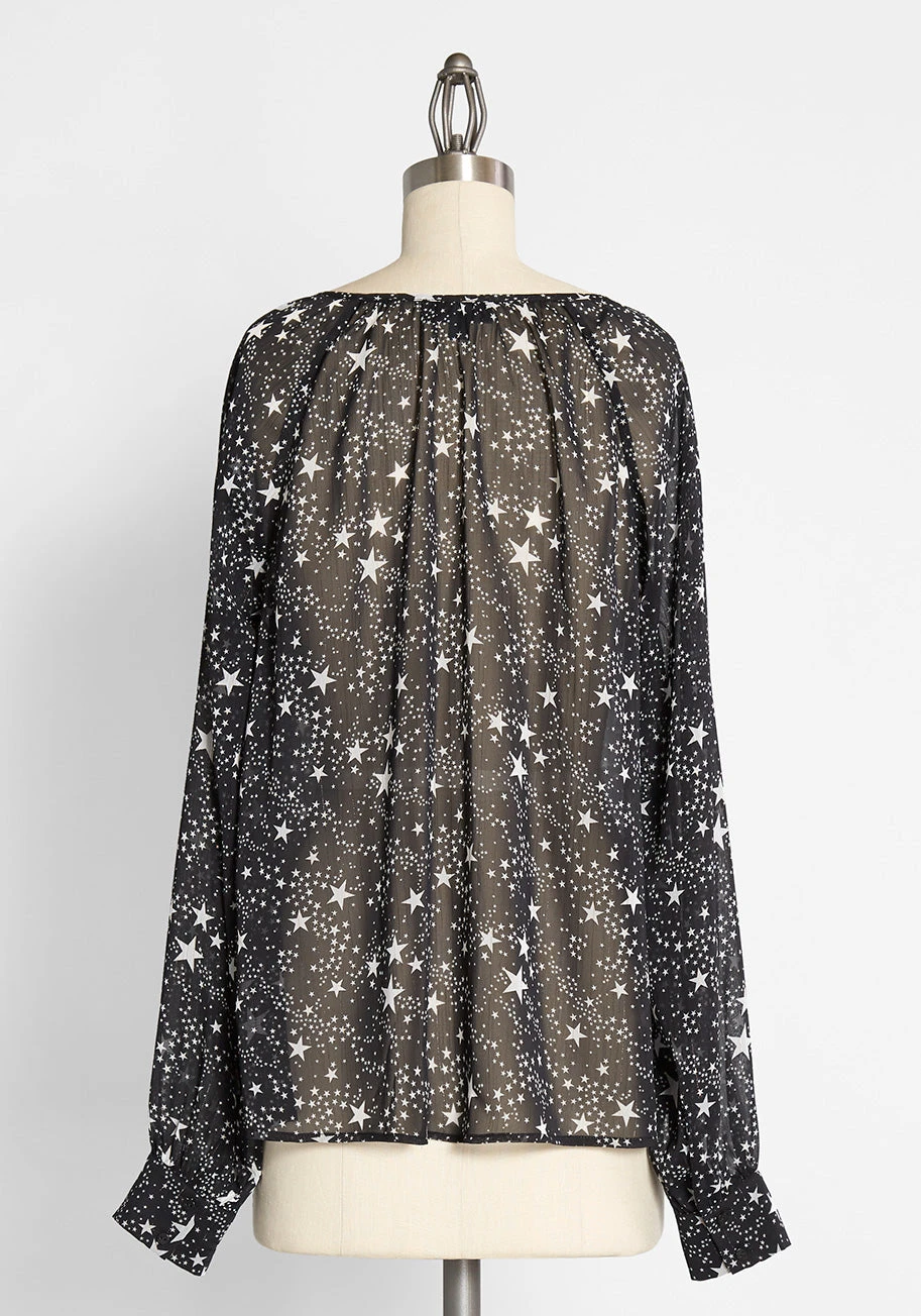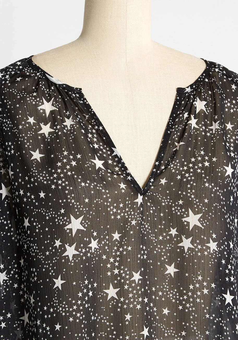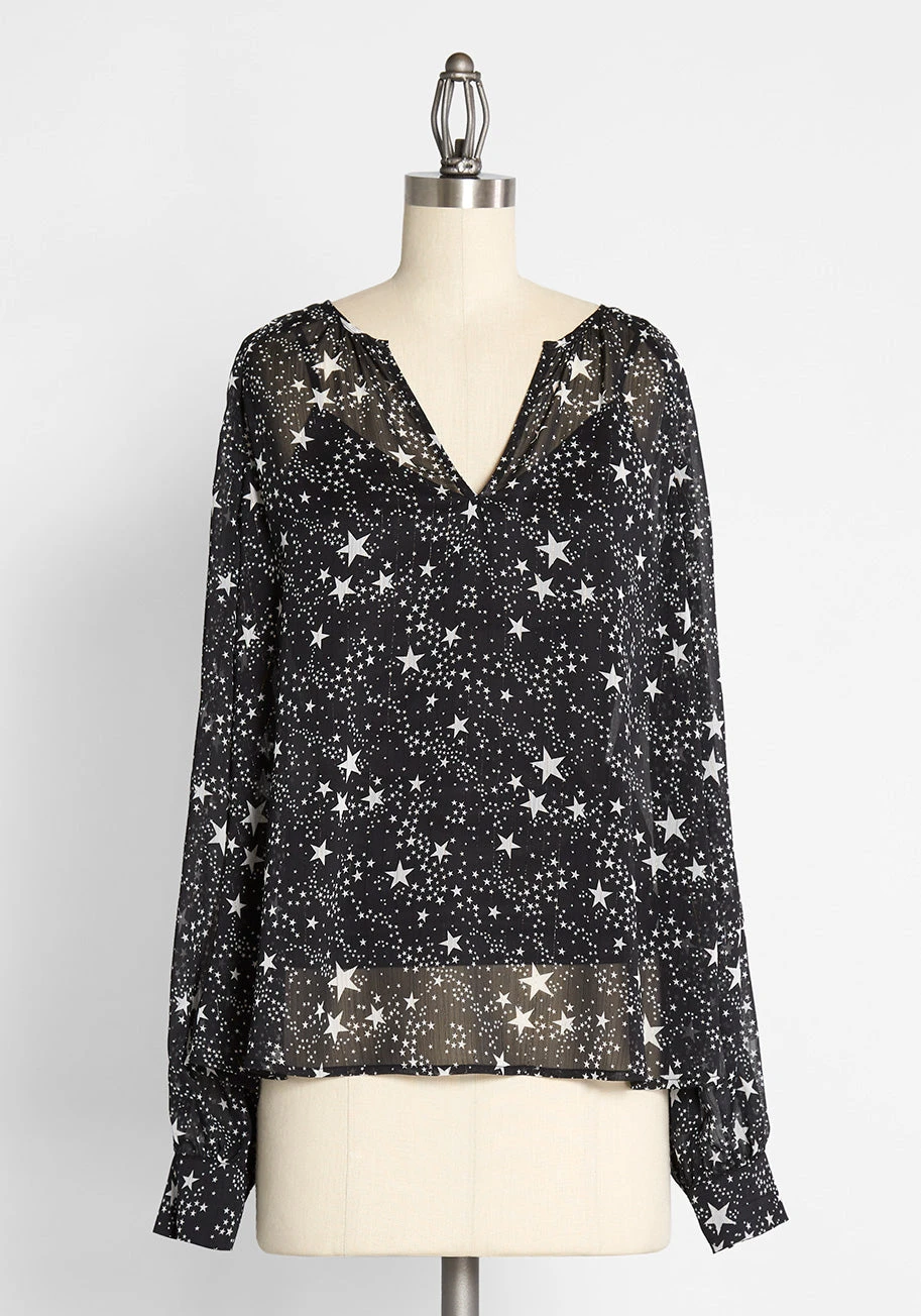Simple, romantic and a tad boho-chic, this relaxed-fitting ModCloth namesake label blouse styles easily with everything from pencil skirts to skinny jeans. Made from a sheer, lightweight, black crinkle fabric, this flowy peasant top flaunts a split-neckline, delicate shirring throughout, button cuffs at billowing raglan sleeves, and an exclusive, hand-designed white star print all over.