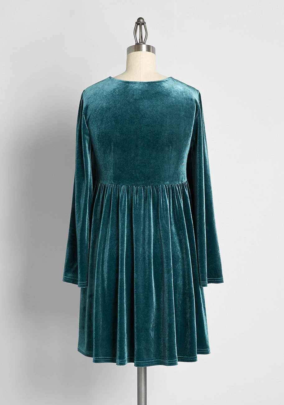 Channeling 1960s boheme and rock-n-roll romance, this luxe velvet dress from our ModCloth namesake label makes for a whimsical choice during the upcoming holiday party season that will make you look as much of the independent person you feel to be. Made from a soft, lustrous stretch velvet knit in a rich teal hue, this unlined babydoll dress boasts a vintage-inspired square neckline, long bell sleeves, and gathering at the empire waist, which adds fullness throughout the swing skirt. A silhouette that was designed to twirl the night away in, you will be aching to find excuses and ways to wear this mini dress over and over again.