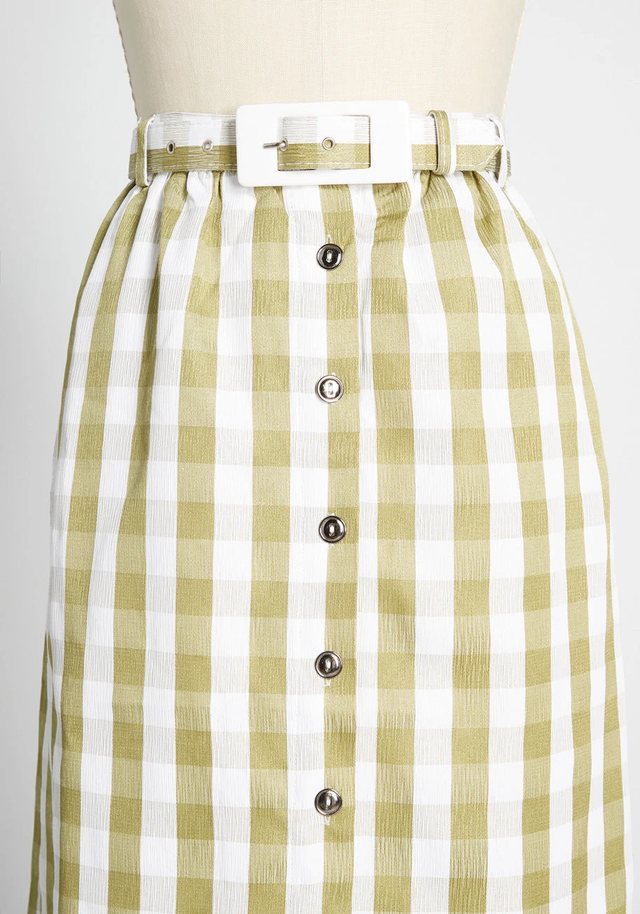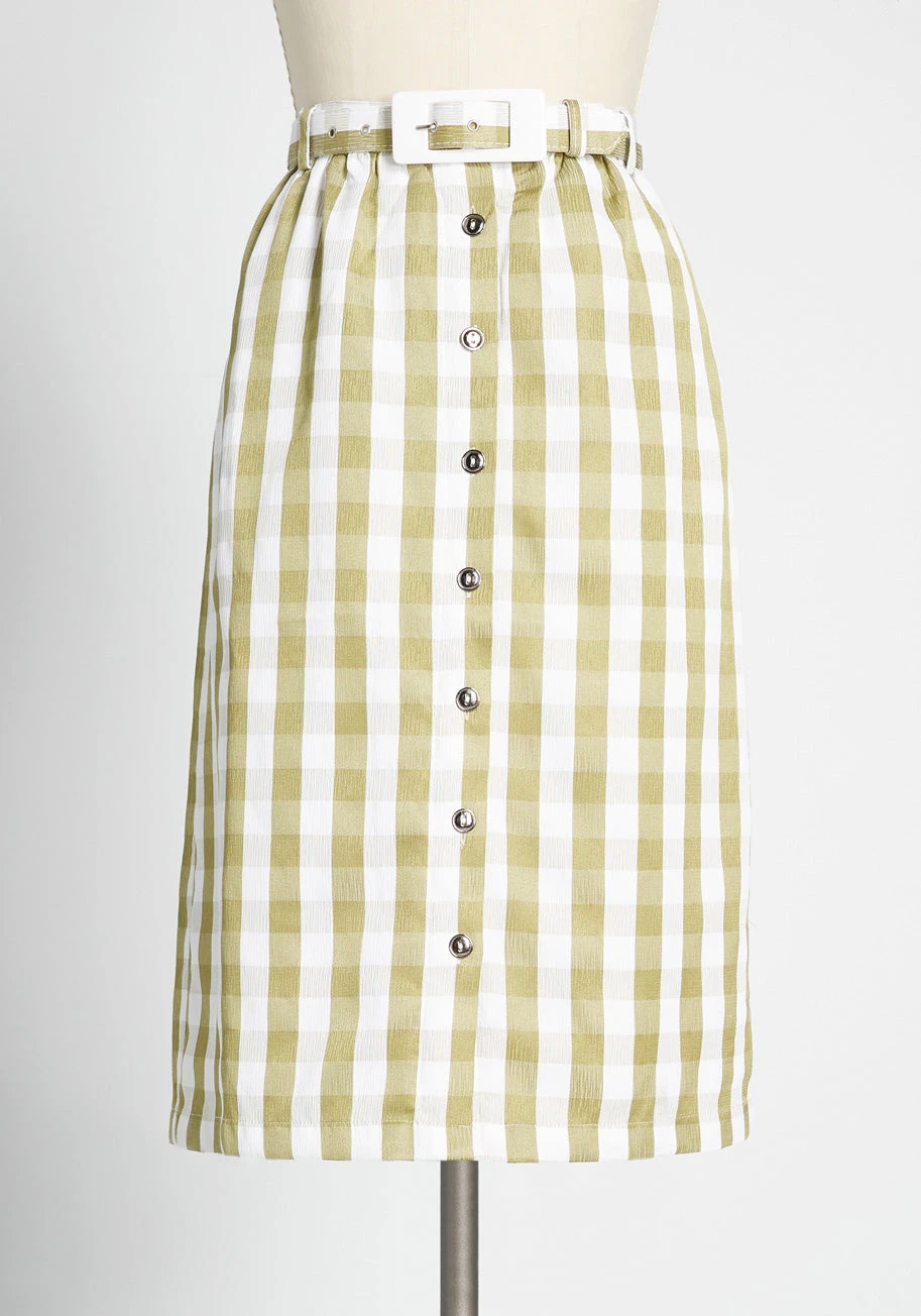 Lately, you’ve been inspired by your vintage record collection, which is why this green-and-white midi skirt is working its way into your everyday ensembles. The gingham pattern adorned across this woven separate feels both timeless and retro-chic! Replete with a high-waisted fit, button-front closures, and matching belt, this ModCloth label bottom practically transports you back to the time of your favorite eras.