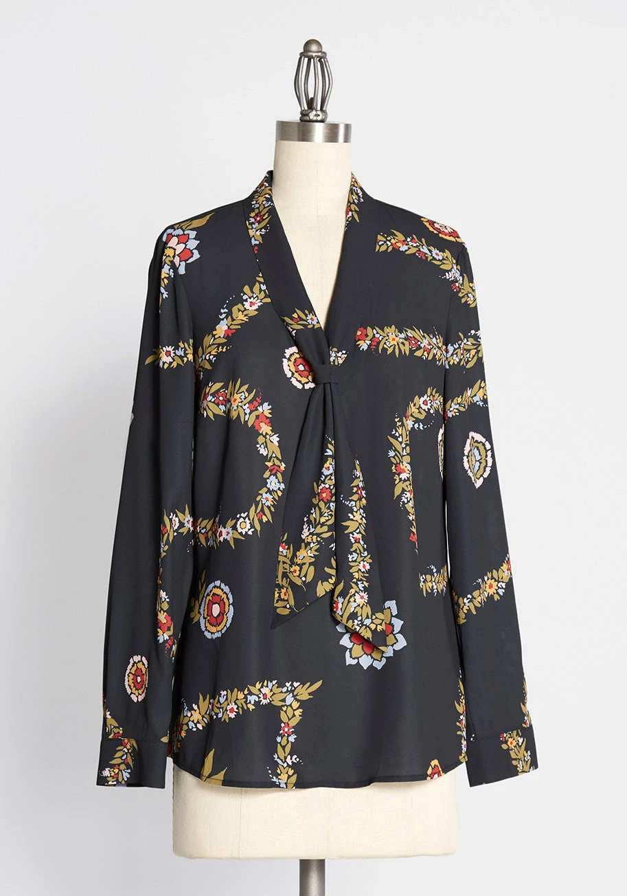 Upbeat and outgoing are only a few of the moods this black blouse creates. From our ModCloth namesake label, this chiffon button up encourages your delightful side to shine through its tied neckline, long sleeves, and beautiful, vintage-inspired floral print.