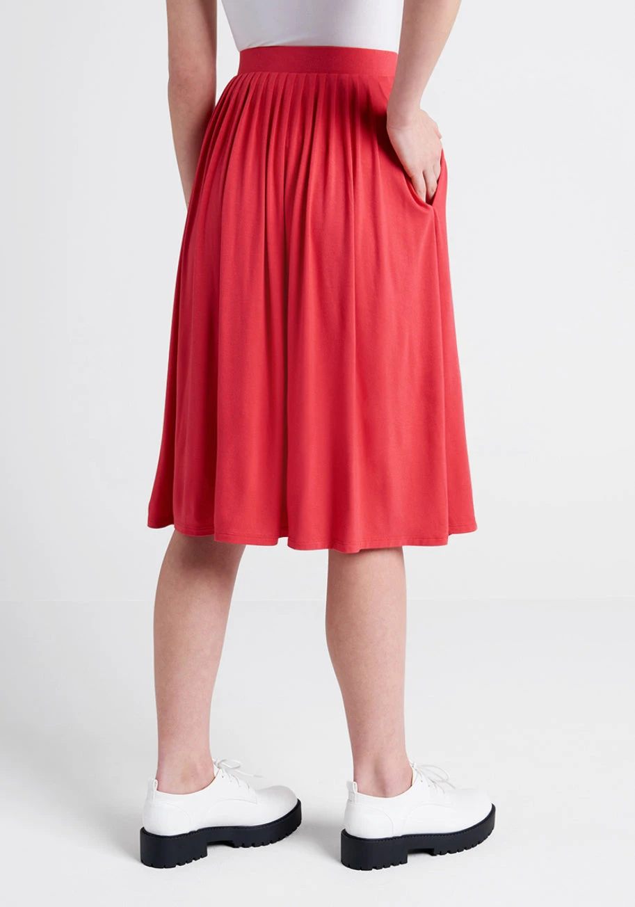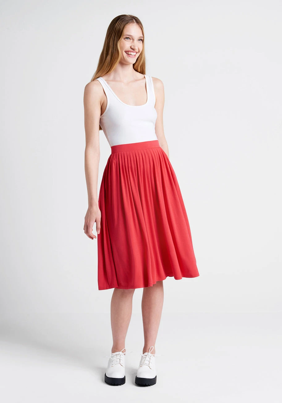 Full of retro-inspired charm and endless styling possibilities, this watermelon red knee skirt from our ModCloth namesake label is truly excellent. Made from a soft and stretchy knit, this red pleated skirt boasts an elasticized, high-rise waistline, ample pleated detailing throughout, handy side pockets, and a breezy knee-length, A-line silhouette.