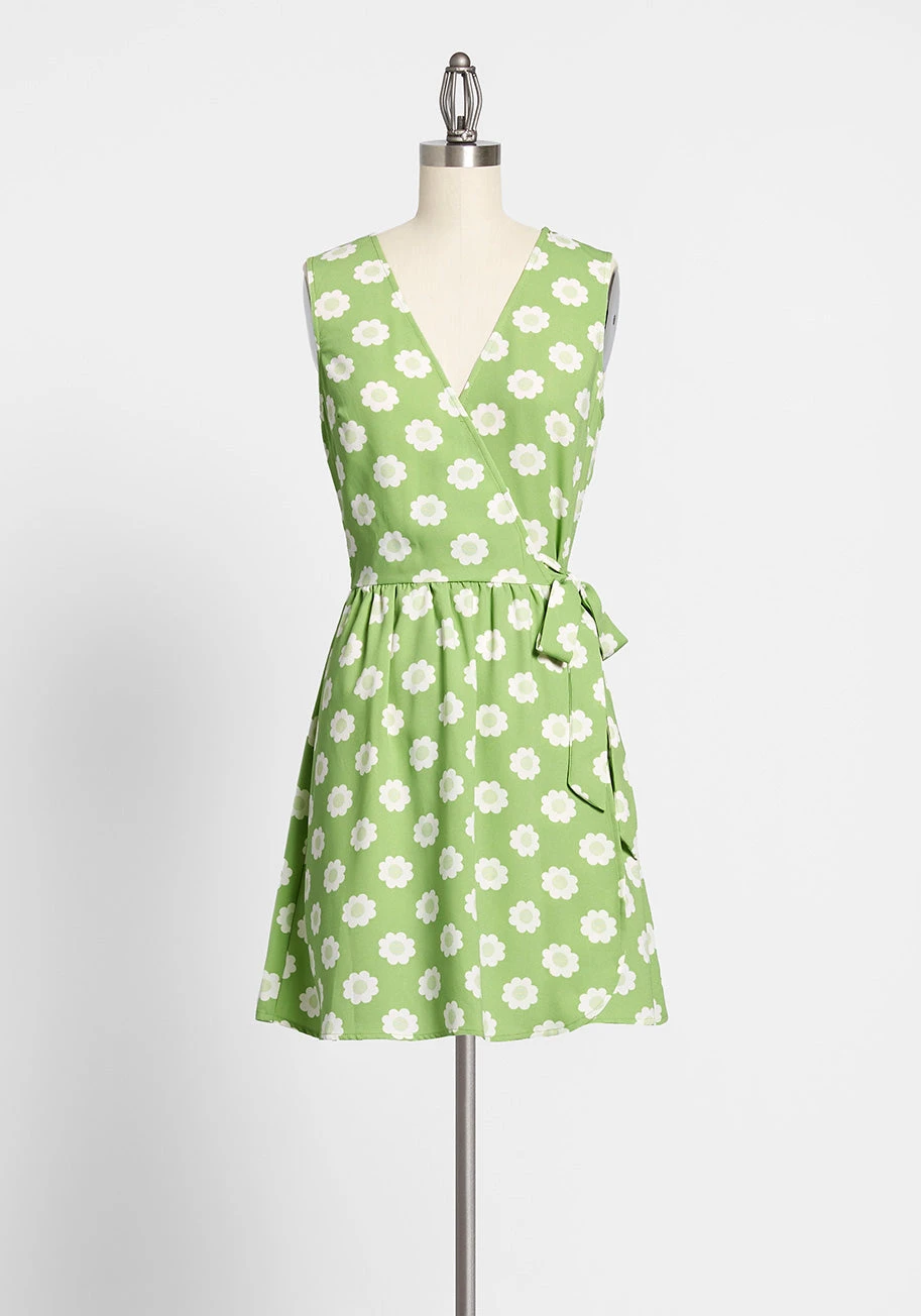 There’s no question that this green wrap dress will be the perfect choice for today’s photo session! Filling every frame with its blissful, 60s-inspired daisy print that was created by our ModCloth label designers, and capturing your natural elegance with its A-line silhouette and surplice neckline, this pretty mini dress will have you feeling ready for your close-up.