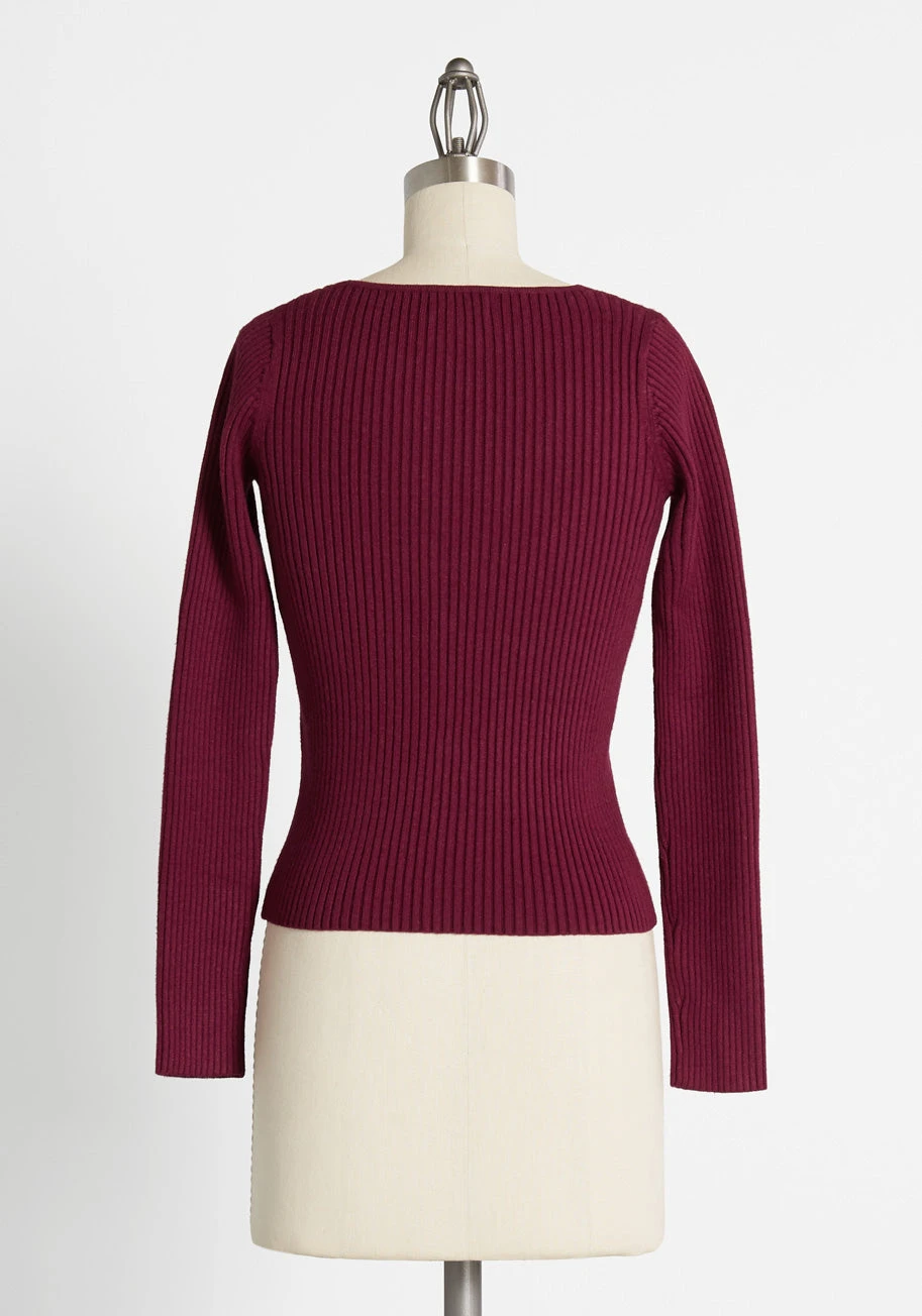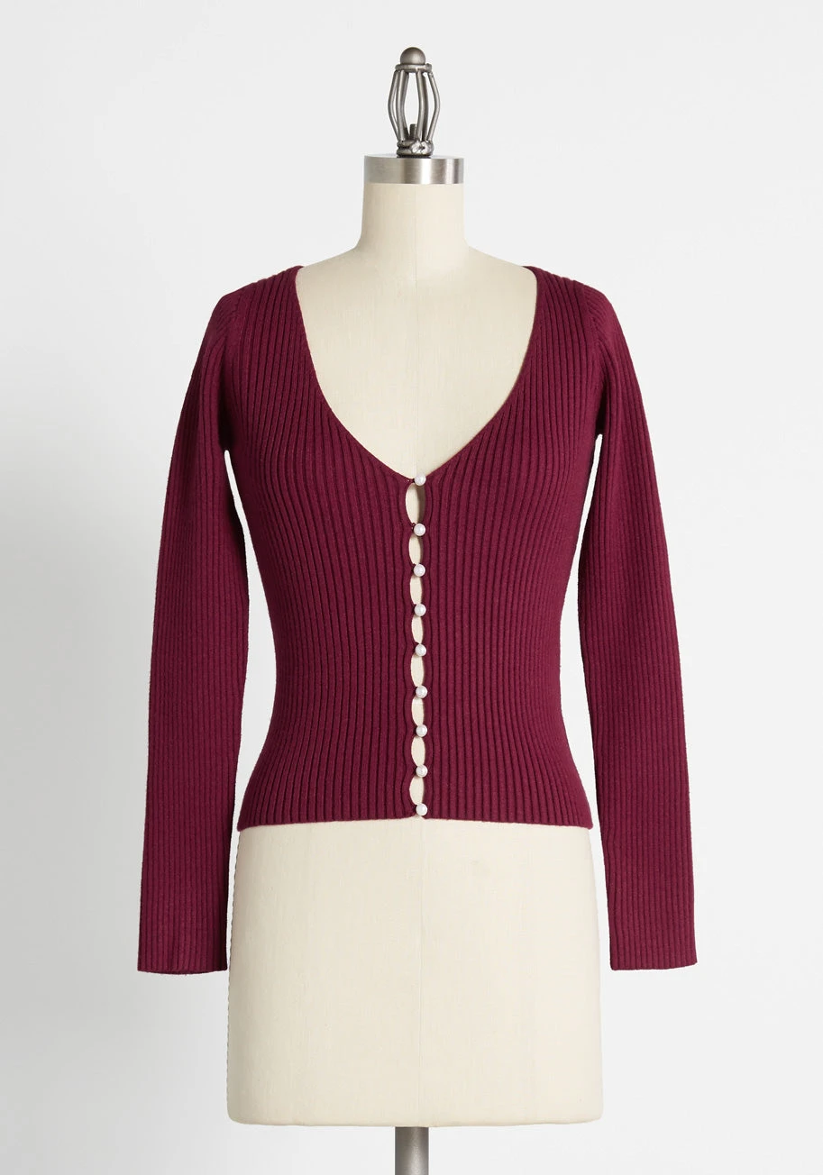 Sleek layers set up extraordinary statements with this burgundy cardigan. Featuring a panel of lustrous, faux pearl buttons at the front, this ribbed knit secures a fitted silhouette, scoop neckline, and long sleeves. Style this layer with dresses, skirts, or with any foundation that needs a little extra cozy.