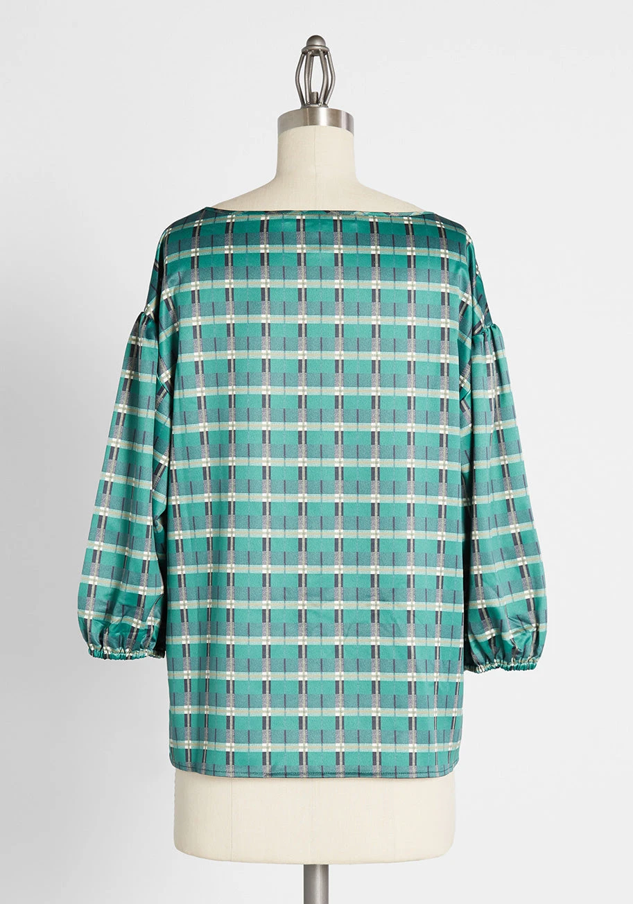 Glow on the go in this vintage-inspired top patterned with a green, white, and black art deco-style plaid. Featuring a scoop neck and billowing peasant sleeves, this fabulously flowy retro shirt by Hutch is an elegant blast from the past!