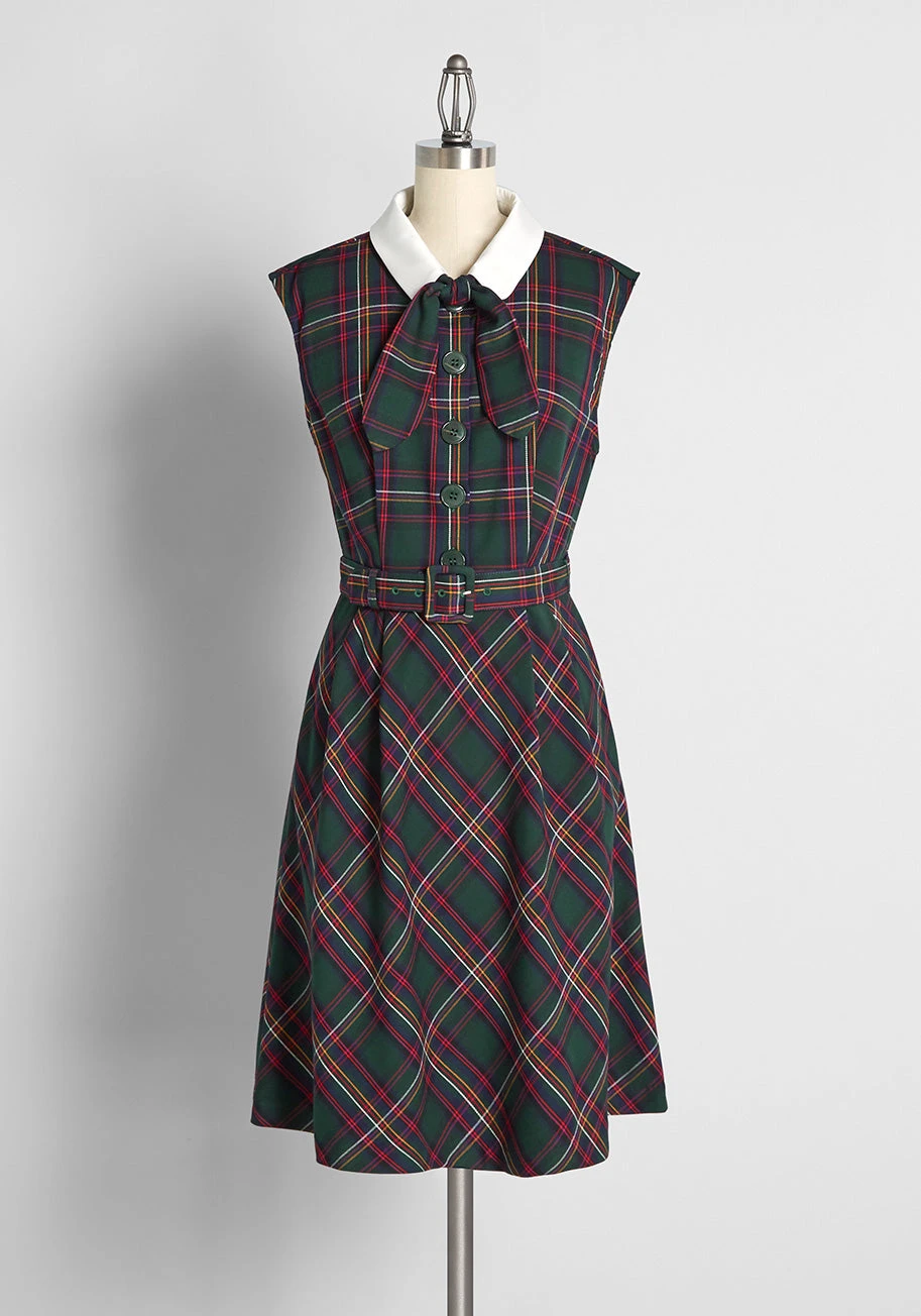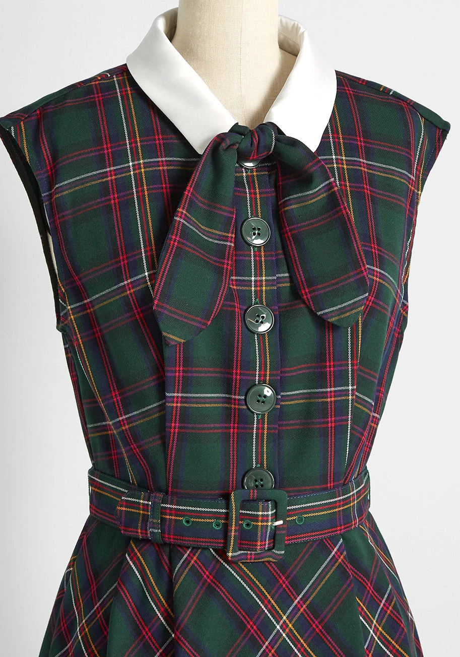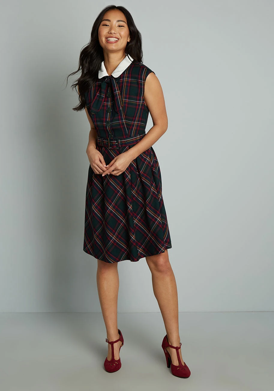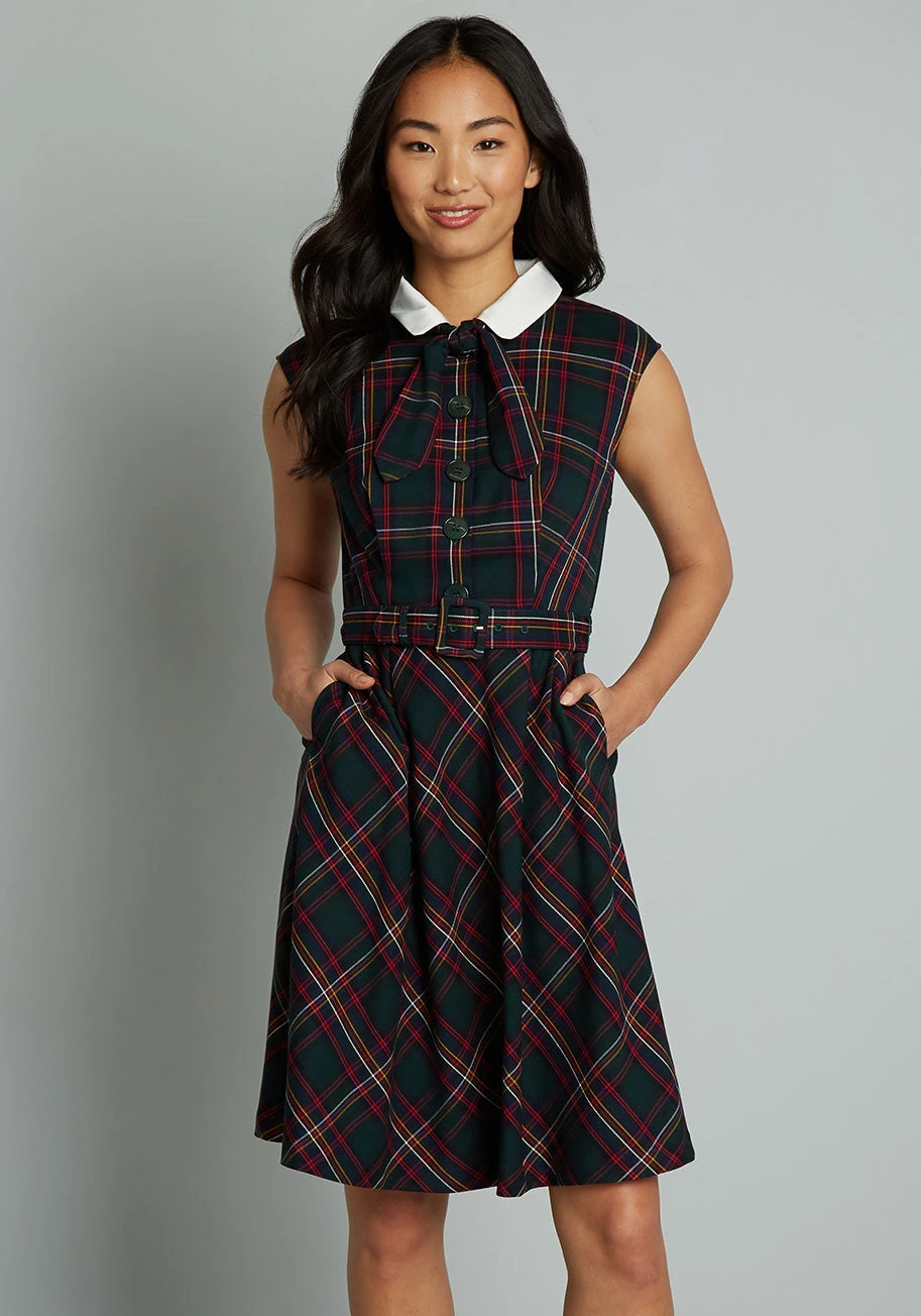 Channeling retro prep school vibes, this plaid fit-and-flare dress from our ModCloth namesake label is sure to become a new favorite! Made from a woven fabric in a hunter green hue with accents of navy blue, red, and yellow, this sleeveless A-line dress boasts a contrasting white point collar with tie-neck detailing, button-up closure at the bodice, a matching and removable belt at the high-rise waist, and a knee-length flare skirt with handy side pockets.