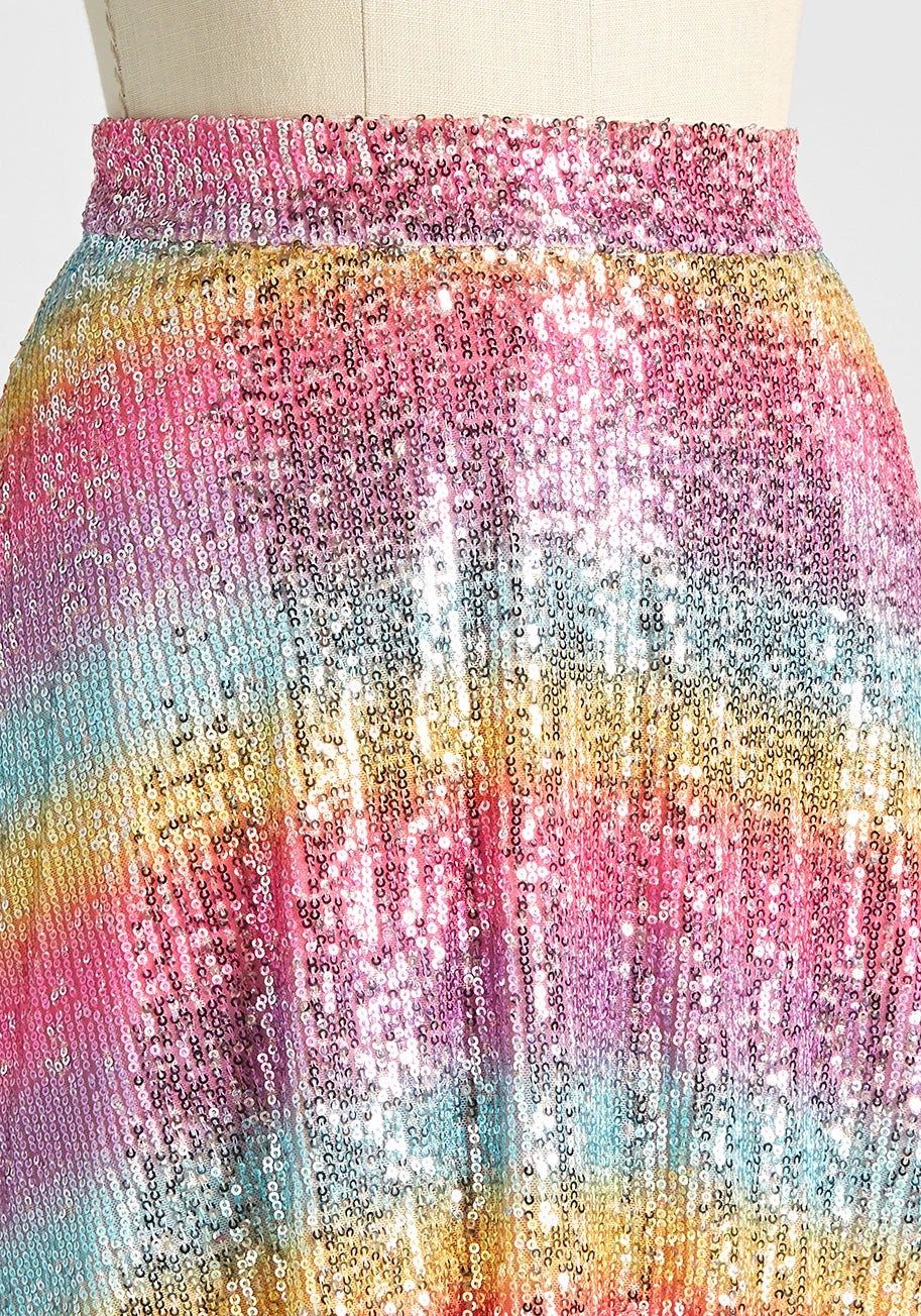 So stunning and sparkly, this fabulous A-line skirt from our ModCloth namesake label is shimmering with retro-chic charm! Made from a stretchy woven fabric, this 70’s-inspired midi skirt boasts a high-rise waistline and handy side pockets. Covered throughout in sparkling sequins that create rainbow stripes of pink, yellow, blue, and purple, this dazzling circle skirt is just gorgeous!