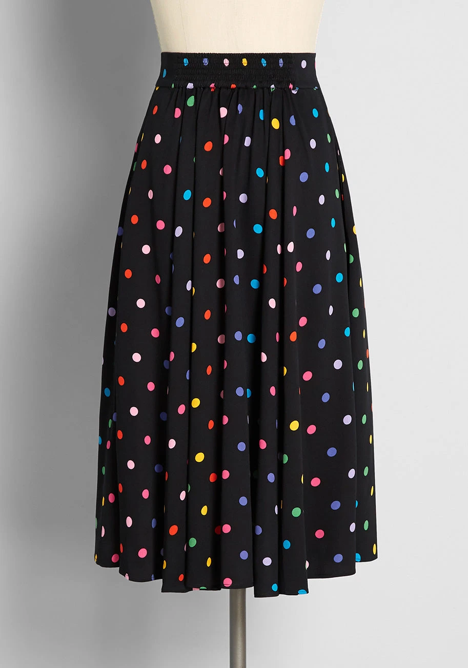 A black midi skirt from UK brand Collectif with a 1940’s-inspired silhouette is given a whole new vibe thanks to an all-over print of rainbow-hued polka-dots! Thoughtfully crafted from sustainable viscose fabric, this stylish A-line skirt boasts front button closure, and a high-rise waist with an elasticized panel at the back for ease of fit. So cheerful and unique, you’ll love finding new ways of styling this retro-chic separate year-round.