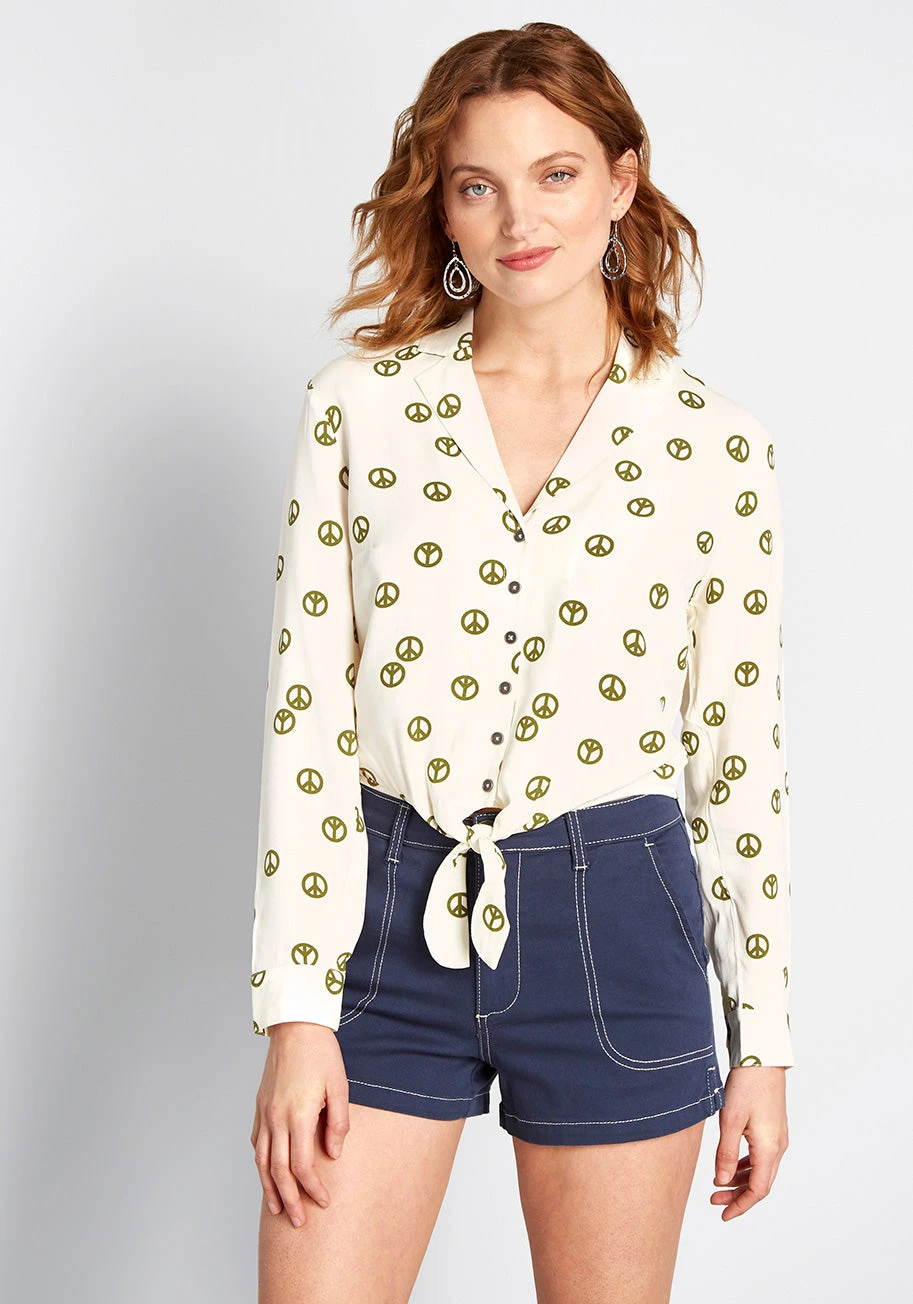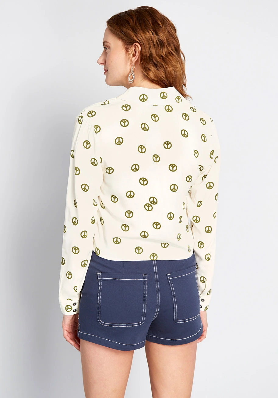 Isn’t it amazing how a timeless style like this ivory blouse can make you feel new again? The classic lapels, long sleeves, waistline ties, and hand-drawn, green peace sign print of this cropped button up from our ModCloth label will rejuvenate your wardrobe with throwback flair!