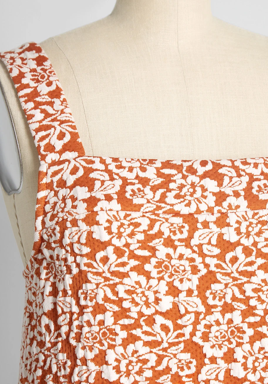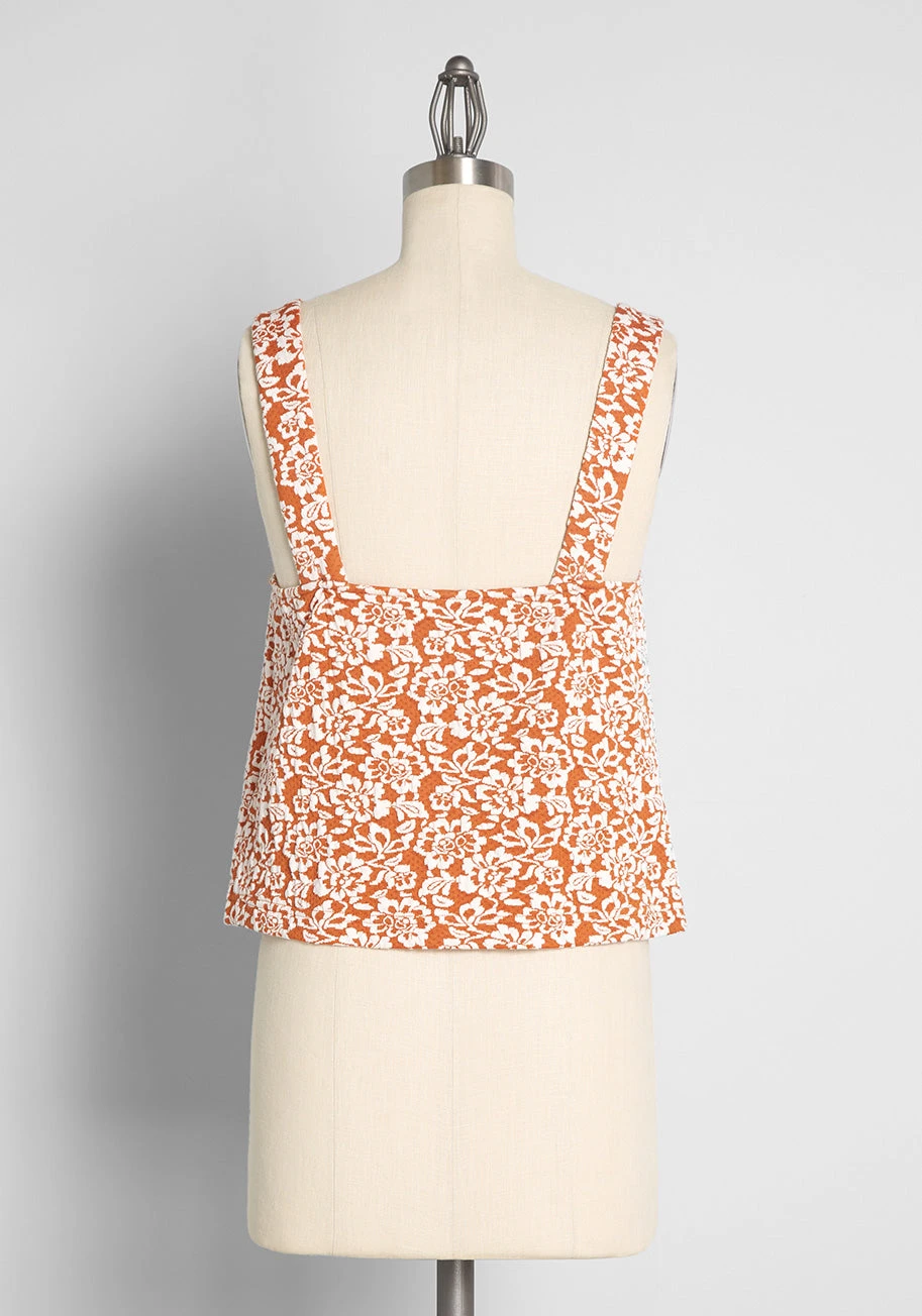 You don’t need a special occasion to receive roses with this burnt orange tank top from our ModCloth namesake label. Made from a soft, lightweight jacquard French terry knit and boasting a raised, all over vintage-inspired white rosette floral pattern, this elevated sleeveless top boasts a square neckline with a plunging back, wide tank straps, and a retro-chic fit complemented by a subtly flared hem. Pair this subtly cropped tank with our matching Ready, Rosette, Go! A-Line Skirt for a vintage-inspired set that will transition beautifully into the cooler seasons ahead.