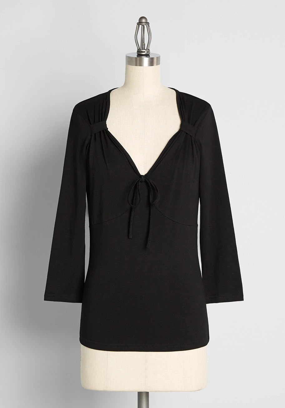 Sweet, simple, and vintage-inspired, this black blouse by Royal Monk is an elevated basic that is ideal for any retro wardrobe. Made from a soft, drapey cotton jersey knit, this ¾ sleeved top boasts a sweetheart neckline with an adjustable tie and seamed bust for a bustier-inspired style that is ultra-feminine and chic!