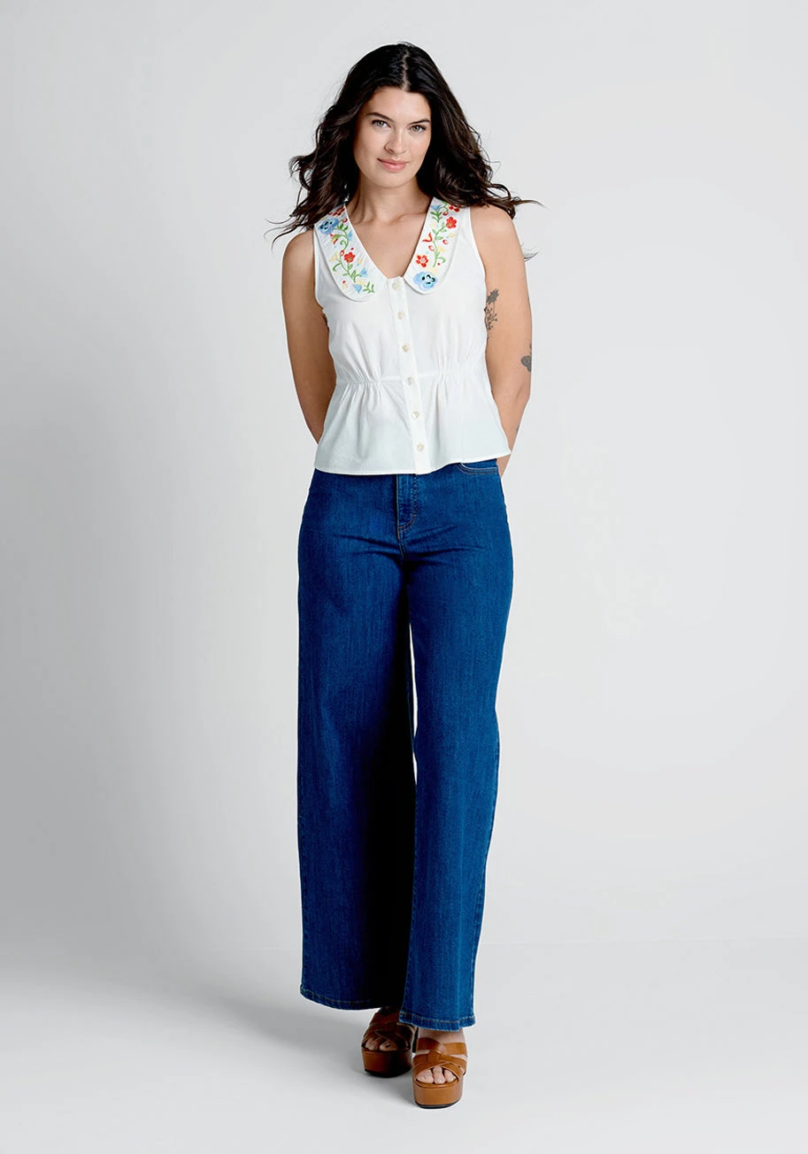 In idyllic cottagecore fashion, this white peplum top from our ModCloth namesake label is beautifully embroidered with a leafy green garland of red, blue, and yellow flowers that delicately adorn the lapel of a stylish Peter Pan collar. Made from a white cotton-rayon blend, this sleeveless button-up top boasts a curved V-neckline, front button closure, and gathered detailing at the natural waist that gives way to an adorable peplum hemline with a subtly cropped finish.
