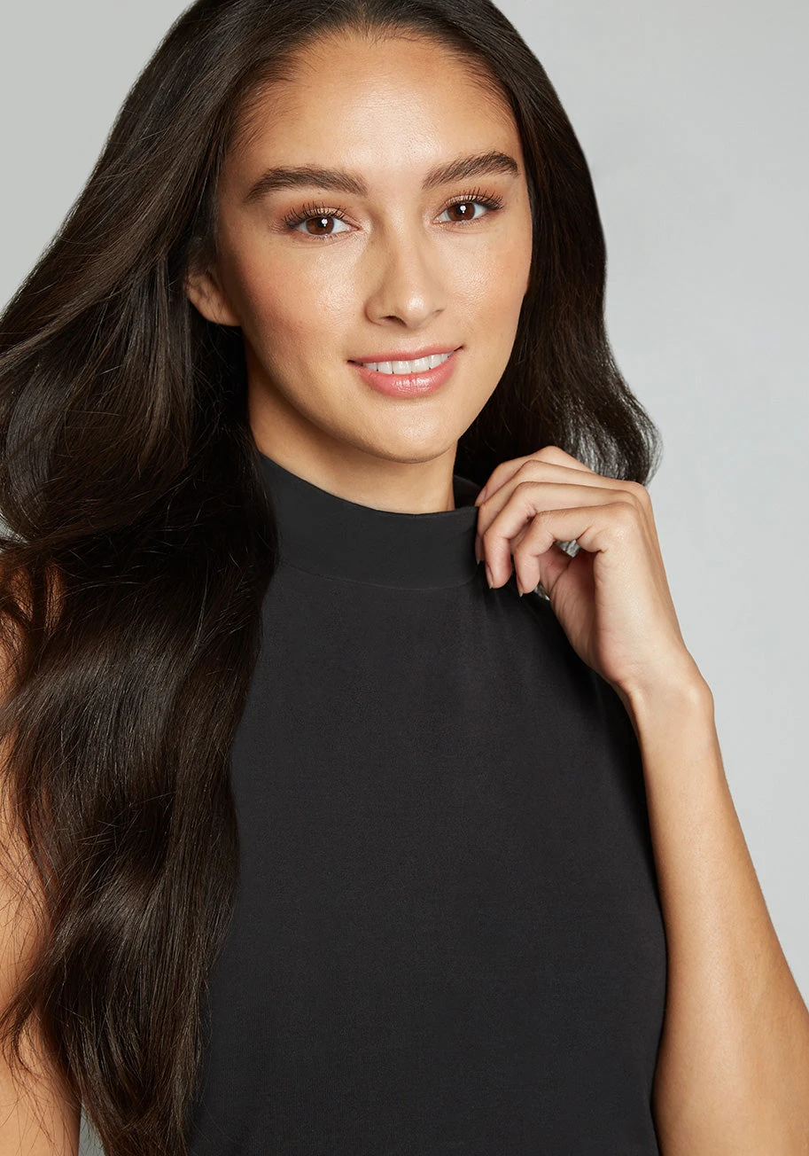 Give your basics a boost with this black top from our ModCloth label. Designed with the wearability of your favorite tee, this versatile piece is made from stretchy cotton with a sleeveless silhouette and retro-inspired mock neckline. Add a midi skirt and glitzy pumps for a night on the town, or pair it with skinny jeans and sandals for weekend brunch.