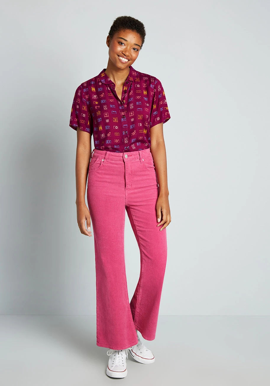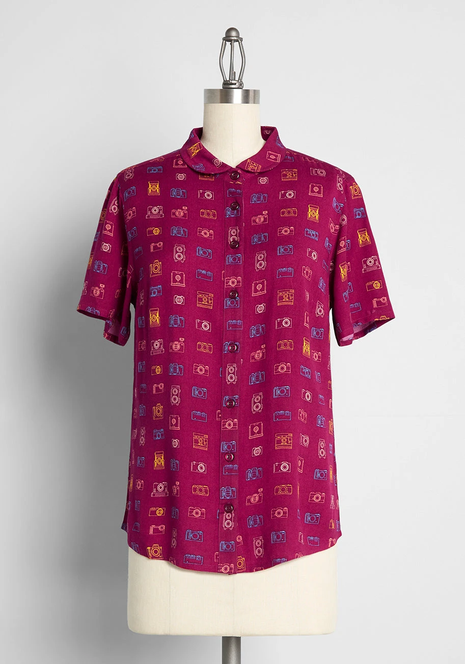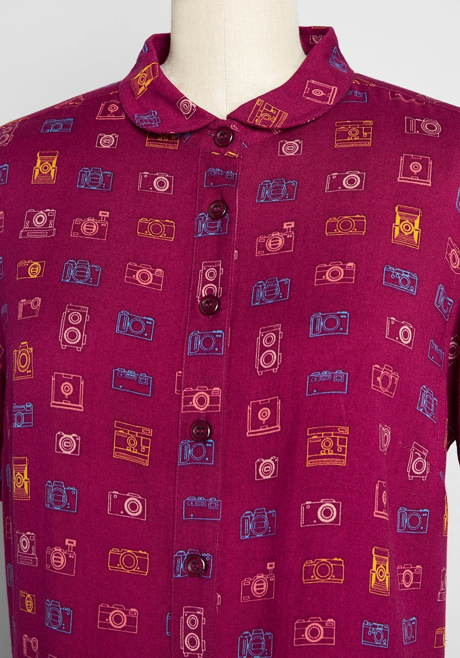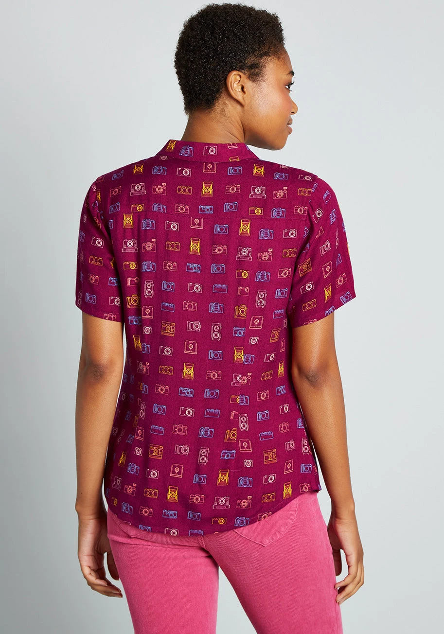 Covered throughout in a darling print made up of vintage-inspired cameras in shades of pink, orange, blue, and yellow, smile and say “cheese” for this burgundy red button-up top from Irish brand Circus! Made from a lightweight woven fabric, this retro-chic blouse boasts short sleeves, button-up closure, a chic curved hemline and a semi-fitted silhouette.