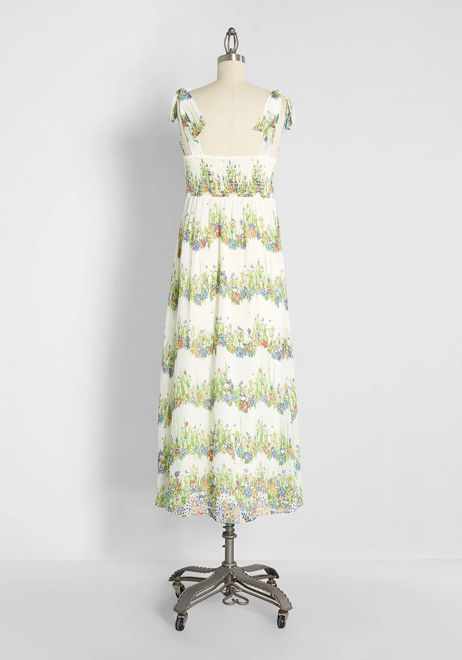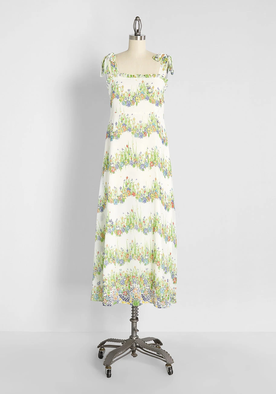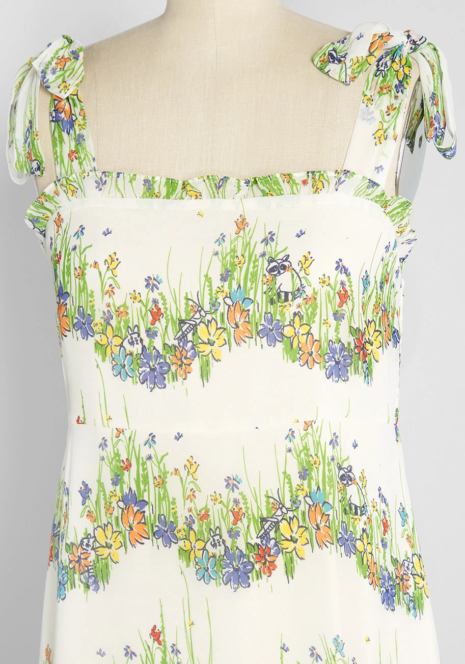 Take on the special occasions of the summer season in luxe boho-chic style when you slip into this off-white midi dress from our ModCloth namesake label. Made from a sheer, flowy chiffon that drapes effortlessly over the body, this fully-lined summer dress is covered in an exclusive, all over hand-drawn floral and fauna print that will have you and onlookers amused by its unique and quirky detailing. Displayed in a scalloped-shaped stripe-like pattern printed atop its off-white background, grassy green sprigs and leaves are ever-present while flowers in red, orange, yellow, blue, and purple hues bloom throughout and are accompanied by black-outlined critter motifs like bunnies, racoons, grasshoppers, and more! With adjustable tie-shoulder straps, frilly ruffle-trim at the square neckline, a smocked panel at the back bodice for an easy, comfortable fit, and an empire waistline that is ultra-flattering, you’ll feel and look your absolute best anywhere you wear this luxe sundress to, from weddings to baby showers to Sunday brunch, you will love the style options this A-line, vintage-inspired dress will give you during those incredibly joyful sunny summer days.