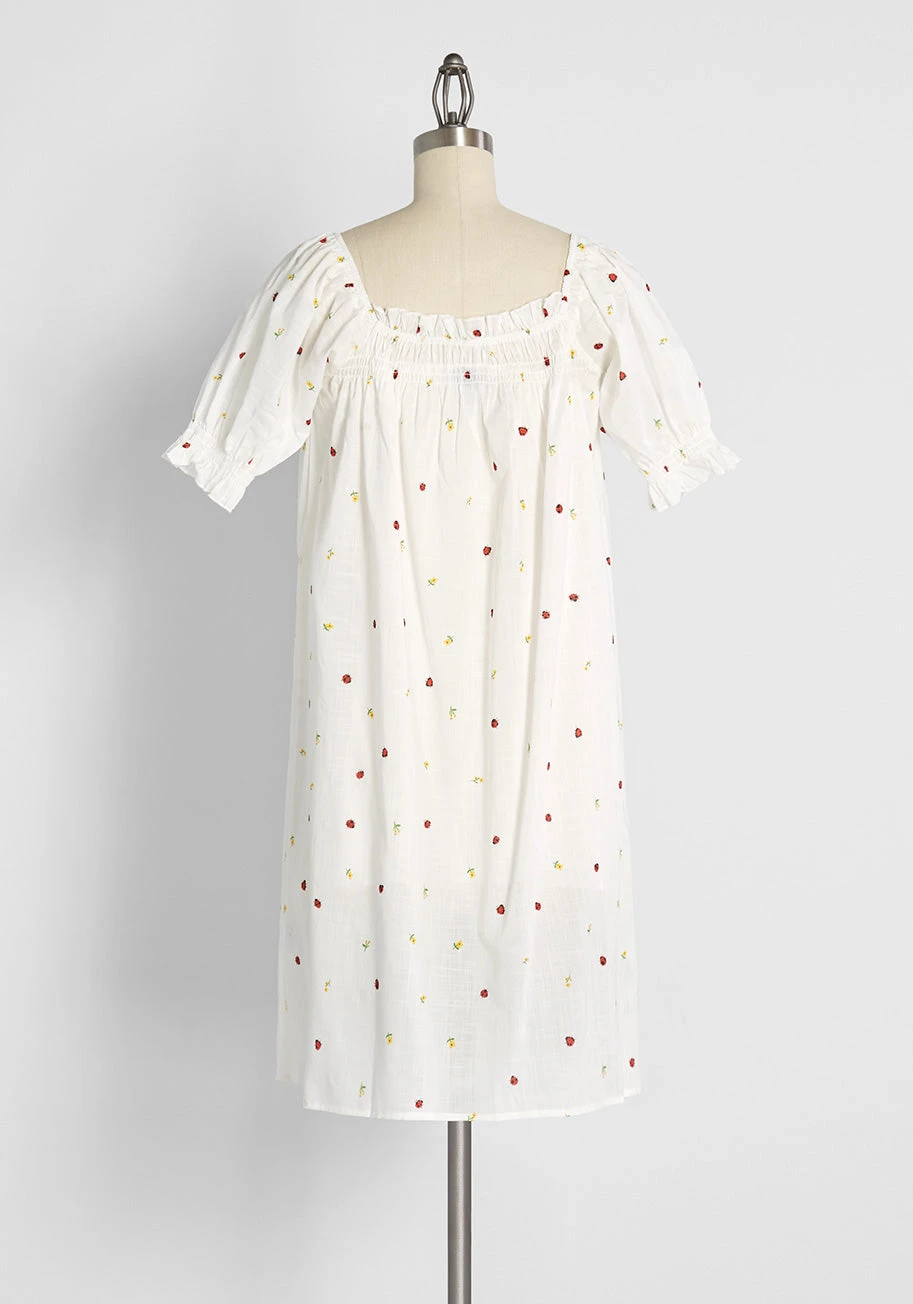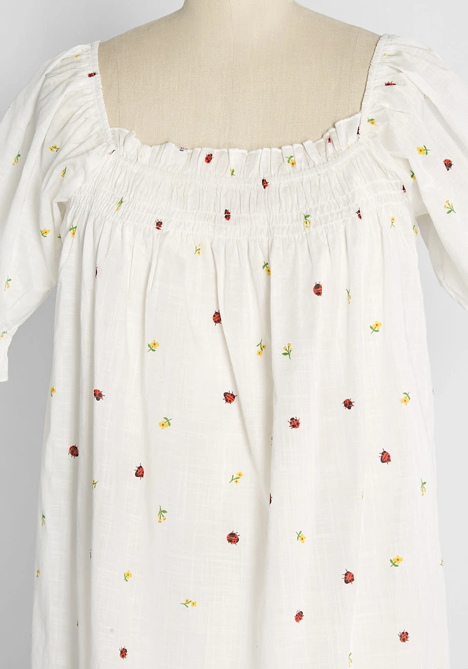 The ladybugs are ready to join you this summer for some sun and fun, and have found their way onto this white ModCloth namesake label sundress in the form of motifs scattered all over. Made from a smooth, woven, lightweight and breathable slub cotton voile fabric in a bright ivory white hue, this babydoll dress boasts intricately detailed, miniature embroidered red and black ladybugs along with multicolored floral motifs scattered throughout this vintage-inspired cottagecore smock silhouette that are custom designed by our in-house design team. With decorative smocking at the scoop neckline adorned with frilly ruffle-trim at the front and back, short puff sleeves, and shirring at the neckline that adds fullness throughout this A-line mini dress. This unique and quirky sundress is ready for the city bustle or the laidback leisure of the weekend getaway you have planned for the near future, wherever you thrive best!