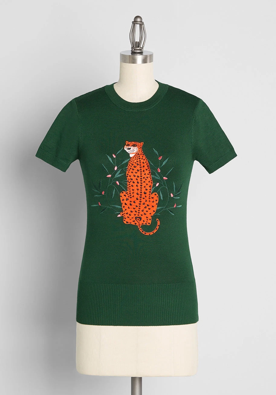 Beautifully embroidered with an orange cheetah peering over their shoulder amidst a tangle of blooming vines, this wildly unique knit top from UK brand Bright and Beautiful is sure to become a favorite in your collection. Made from a stretchy, viscose-blend knit, this emerald green top boasts short sleeves and ribbed-knit detailing at the crew neck, cuffs, and wide hemline. With a snugly fitted silhouette, this short sleeve sweater fits best when sized up!