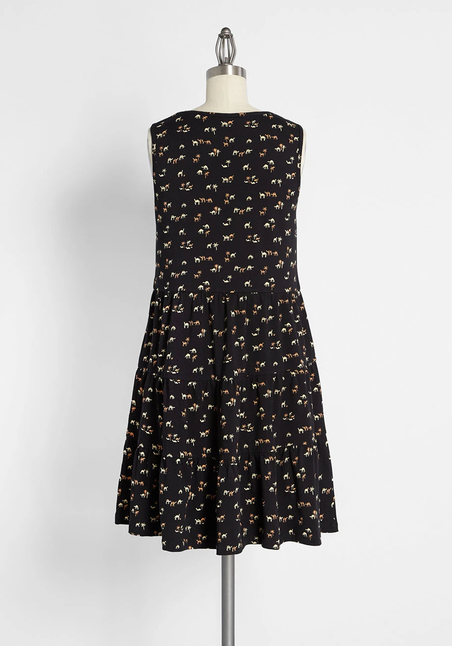 An adorable micro-print of ivory and peach-toned camels traveling with their packs through the desert night or resting in the sand is emblazoned throughout this black babydoll dress from Mata Traders. Made sustainably using a stretchy cotton-blend woven fabric, this unique sleeveless sundress boasts a relaxed fit and an above-the-knee tiered skirt with subtle gathered detailing throughout. So perfect for warm days on the go, you’ll love throwing this effortlessly vintage-inspired mini dress on as you rush out the door onto your next great adventure.