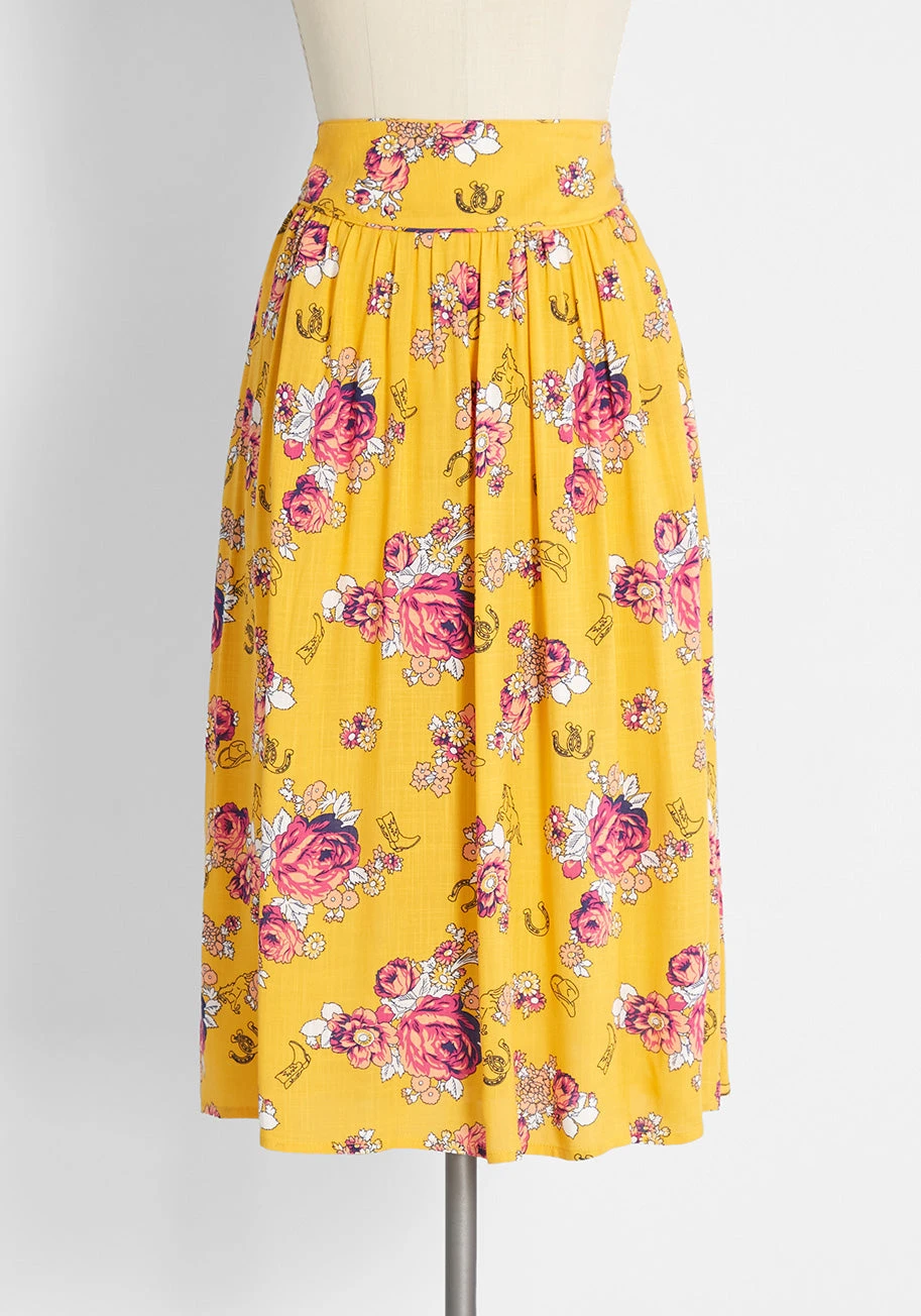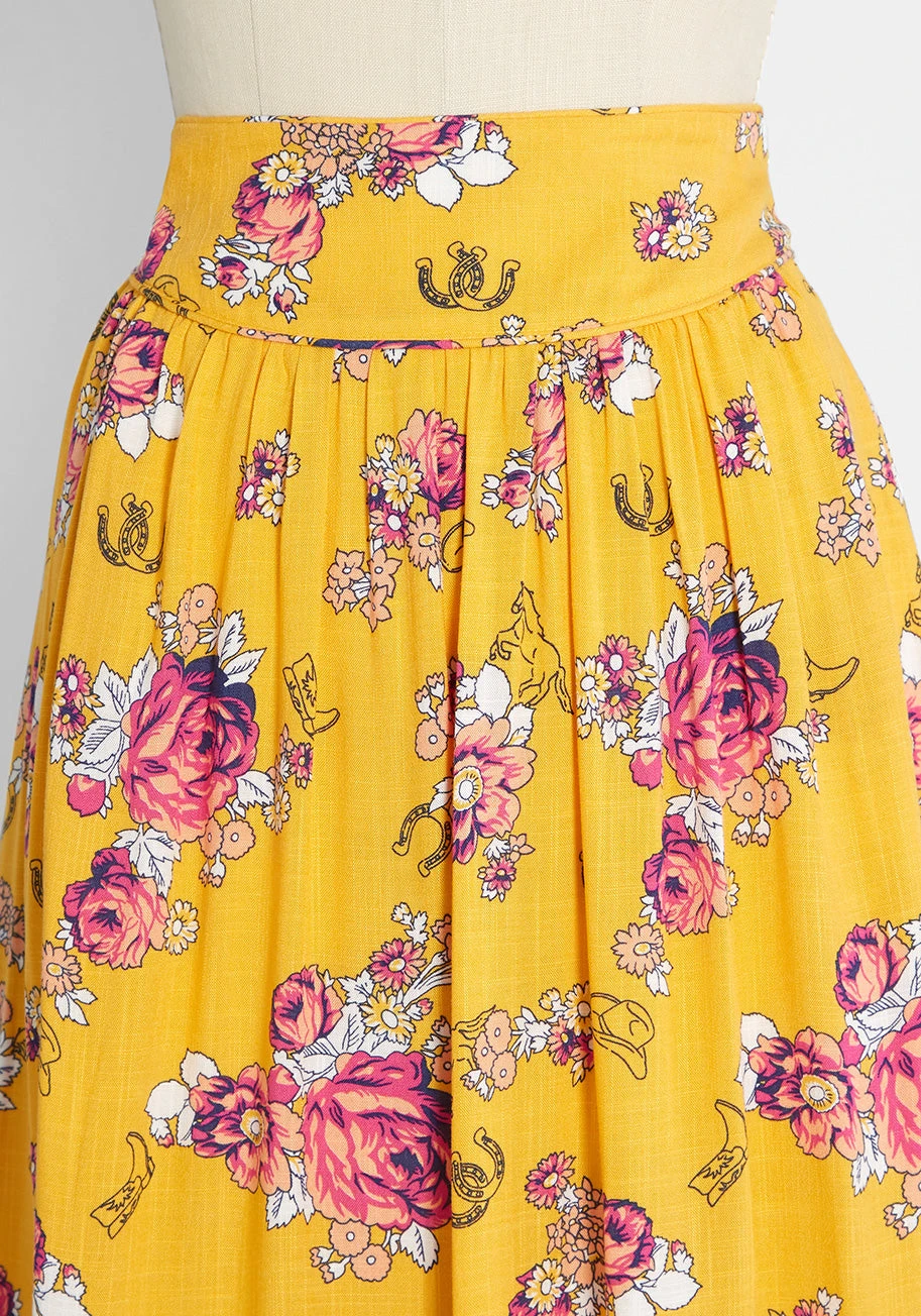 Mixing vintage sourced rose motifs in pink and red hues taken from a 1960s scarf, accented with Western-inspired rodeo icons like cowboy boots, cowboy hats, and horseshoes throughout atop a bright yellow background, this in-house designed, quirky floral print is displayed throughout this ModCloth namesake label skirt. Crafted from a lightweight, slightly textured rayon weave, this high-waisted swing skirt features piping at the front curved yoke seam, with shirred detailing adding fullness throughout. This unlined midi is flattering and flowy, giving you ample opportunity to wear it in an array of ways, depending on your mood and season. You will be swinging and spinning in this Western-inspired skirt all day and night long under the star-lit desert night sky.