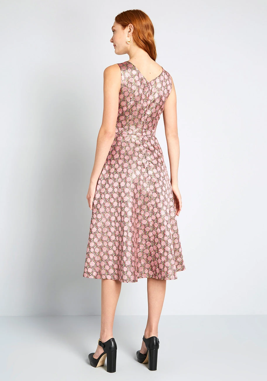 Make your appearance the talk of the party by debuting this pink fit-and-flare dress! Featuring jacquard metallic dots and a sleeveless silhouette, this pocketed midi by our ModCloth label takes the stress out of finding the perfect special occasion outfit.
