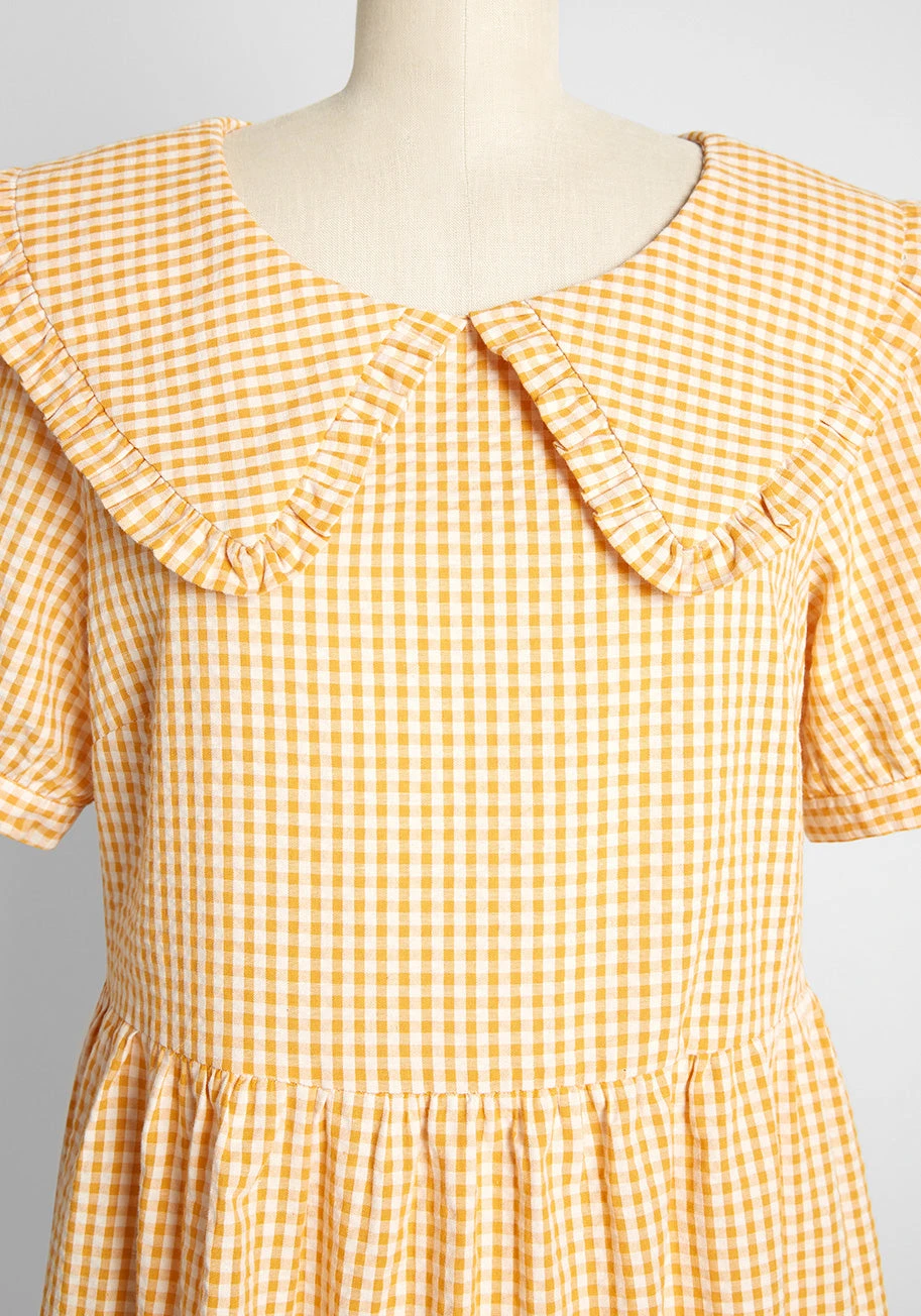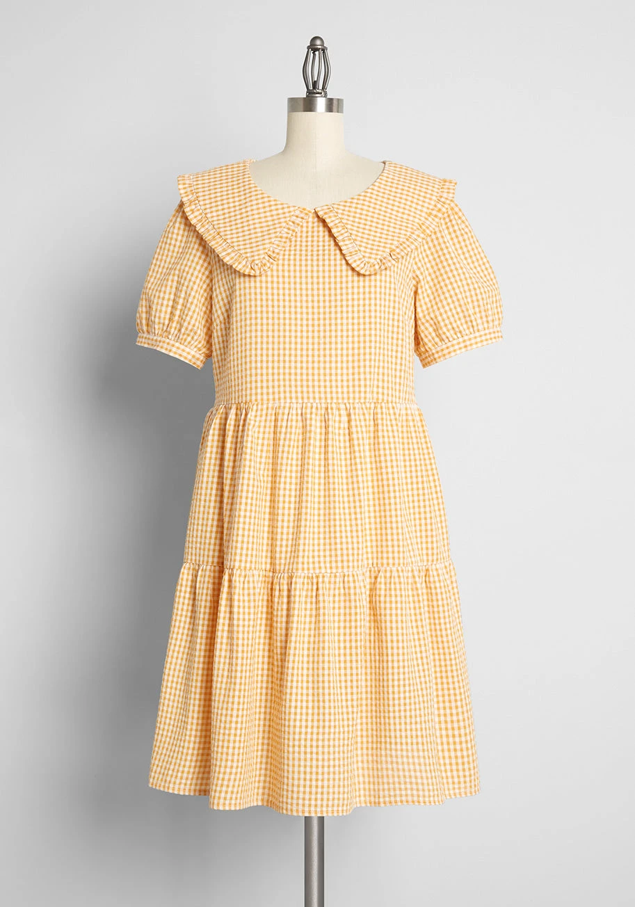 So easily dressed up or down, this vintage-inspired, plaid babydoll dress from Aussie brand Princess Highway is destined to be a go-to in your collection. Made from a lightweight cotton weave with a yellow and ivory gingham print, this sweet smock dress boasts a sailor-inspired collar trimmed with a subtle frill and keyhole and button closure at the back, puff sleeves, and a gathered empire waistline that leads to a retro-chic, two-tier, knee-length skirt.