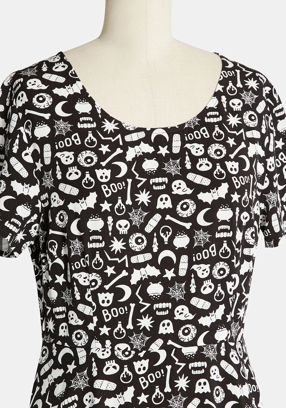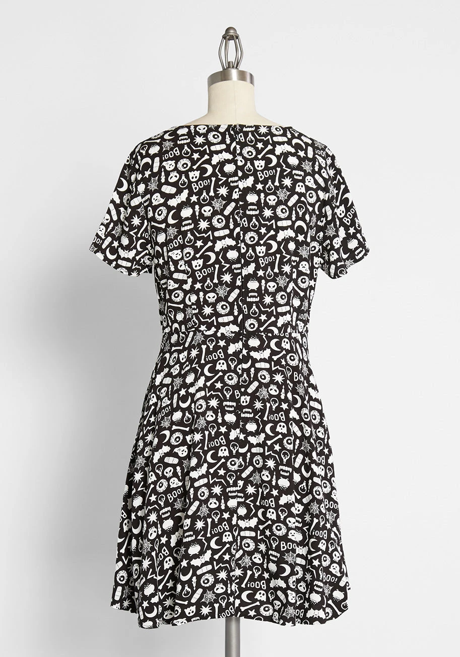 Channel a festive and feminine look in this black skater dress from Aussie label Black Friday! This lightweight mini delivers ‘90s-inspired style, all thanks to its defined waistline, short sleeves, crew neck, and A-line silhouette, while its all over white Halloween motif print offers unexpected kitsch. So spooky yet still so cute!