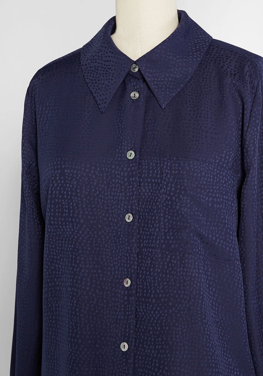 A classic silhouette with a vintage-inspired twist, what more could you want from a ModCloth namesake label shirt? This button-up offering is made from a silky jacquard satin in a deep blue hue that is adorned all over with a textured spot pattern. The subtly exaggerated collar, patch pocket at the chest, and its relaxed fit make this 1970s-inspired blouse a versatile option that can pair well with just about anything!