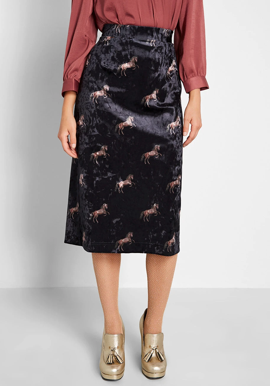 Sing your praises of this black pencil skirt loud and clear for all to hear! Stretchy so that it fits flatteringly against your figure, this velvet separate from our ModCloth label stars colorful horses, an elasticized waist, and a whole ‘lotta sass.