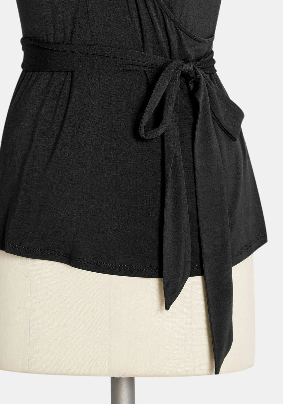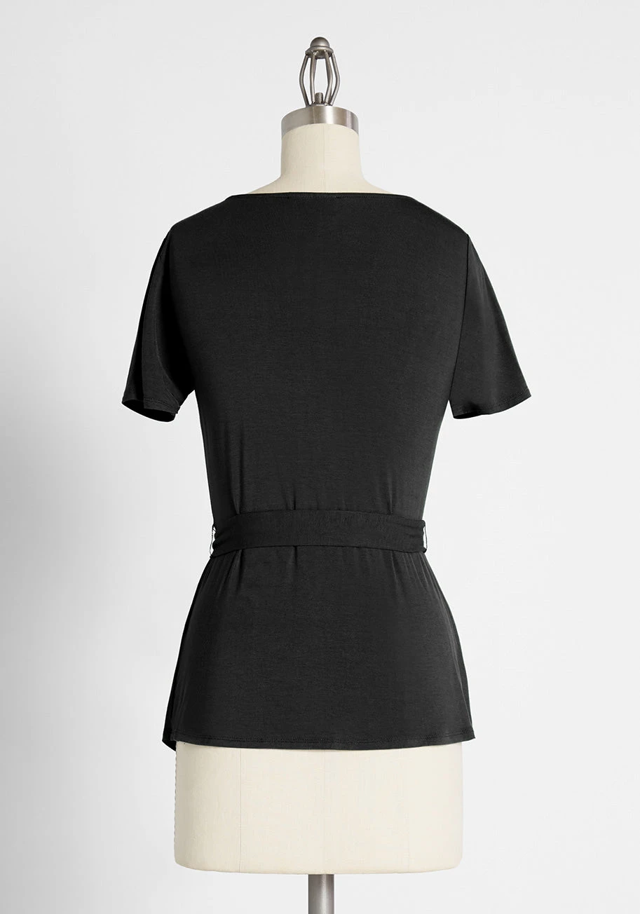Need a new top for that virtual happy hour? Then say “hello” to this chic, black faux-wrap top! Crafted from soft, stretch-knit fabric, this sash-tied separate boasts a sultry surplice neckline and total comfort. Try pairing this ModCloth label piece with skinny jeans and flats for a darling daytime look, then switch things up with strappy heels and a pencil skirt for a timeless ‘desk-to-dinner’ outfit.