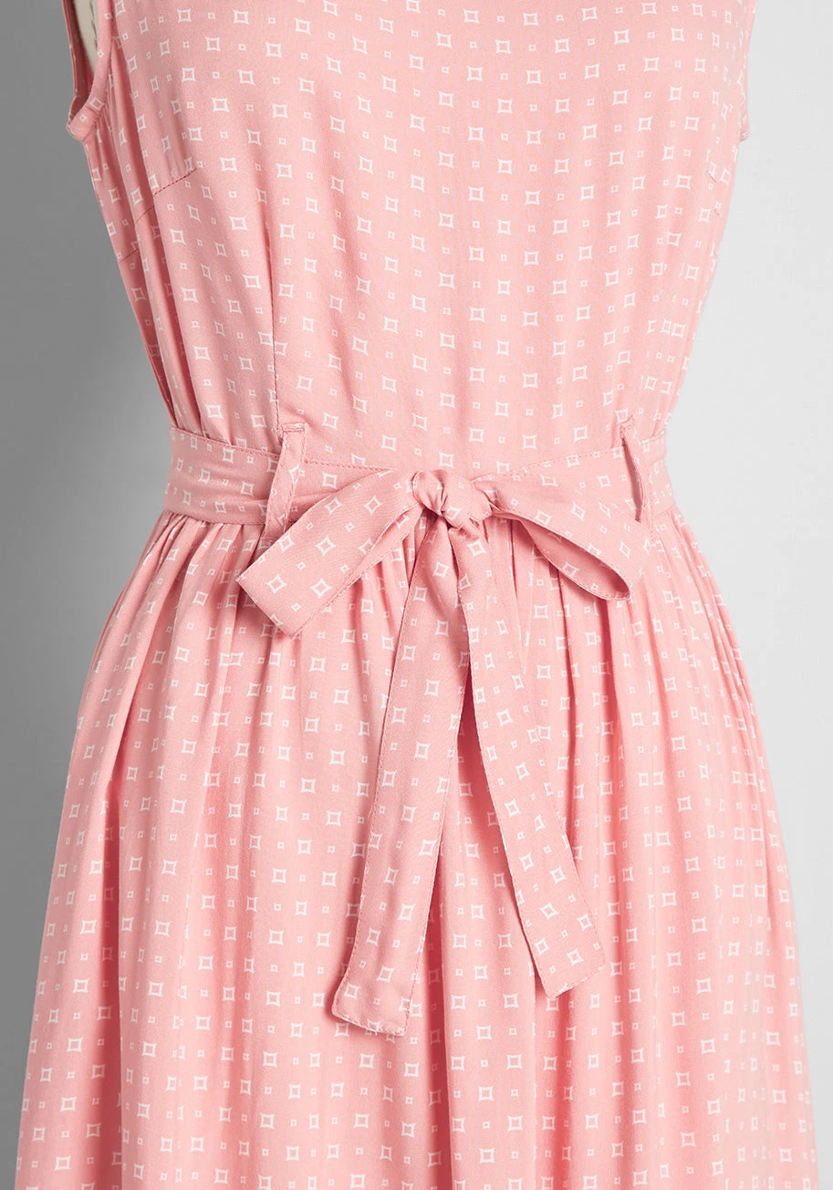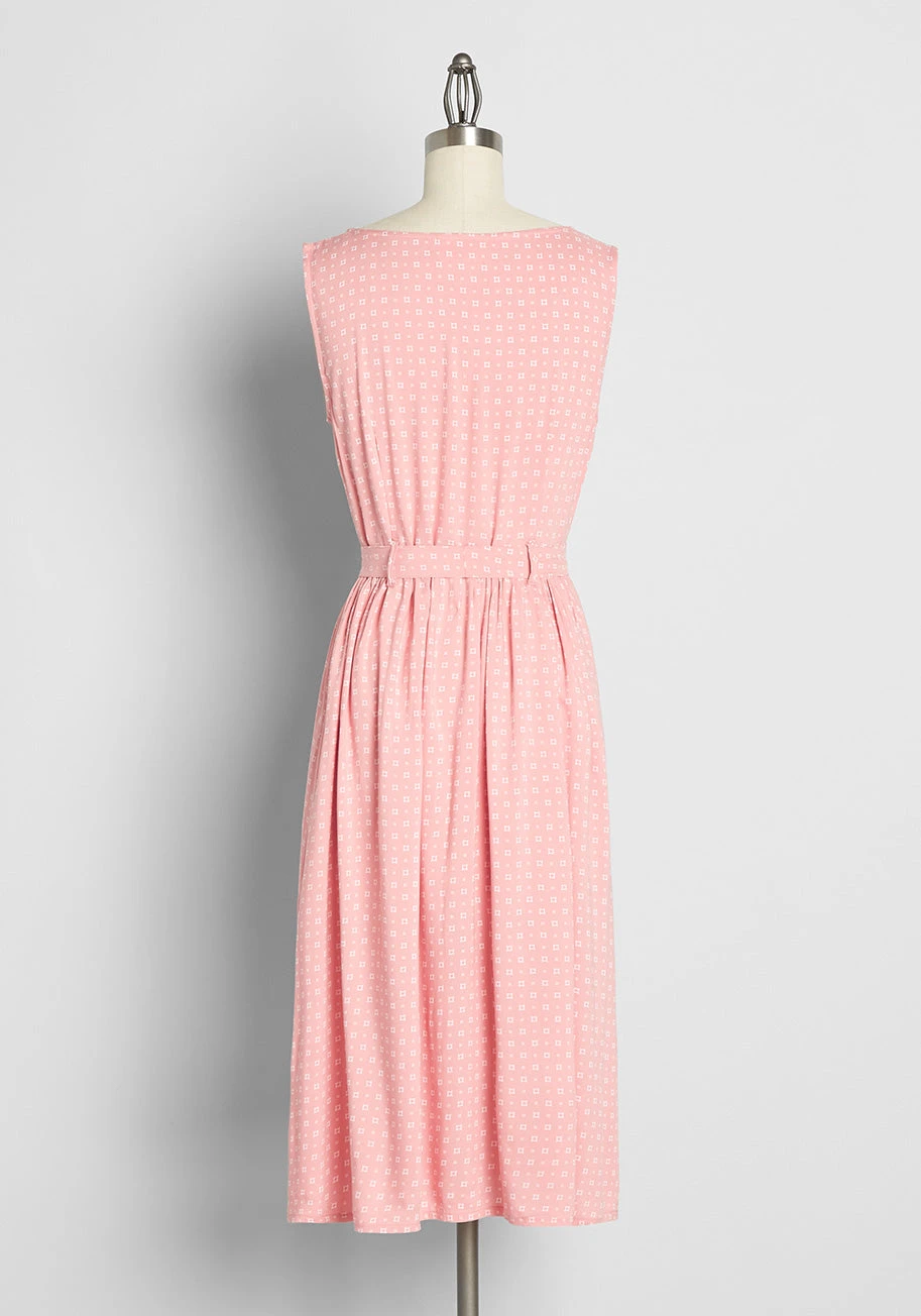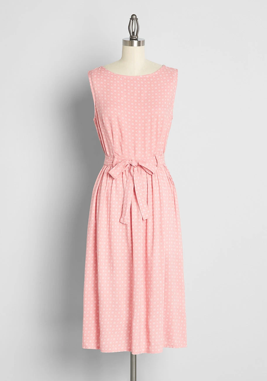 In a creamy shade of pink, this effortlessly sweet midi dress from Circus is covered throughout in a retro-chic geometric print of cream-hued, square-shaped polka-dots. Made from a lightweight woven fabric, this vintage-inspired sleeveless dress features a boat neckline, a semi-fitted bodice, a removable and matching tie-waist sash, and a flowy A-line midi skirt.