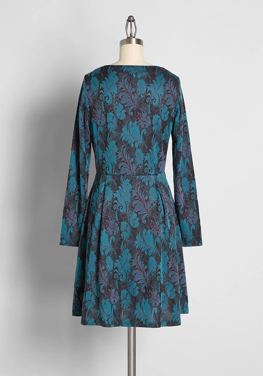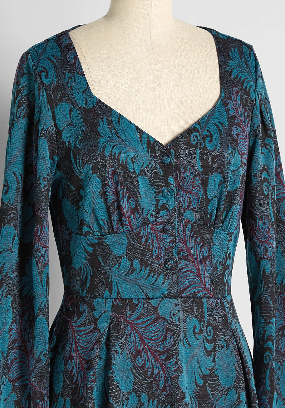A lot of thought went into creating this adorably detailed, vintage-inspired dress from our ModCloth namesake label, and it shows! Made from a black knit fabric that is richly adorned in an all over jacquard design of wispy teal-hued ostrich feathers that are accented in either grey or burgundy red, this long sleeve dress boasts a fitted bodice with button-up closure, a sweetheart neckline, delicate shirring at the bustline, and a cumberbund-inspired insert at the waist. The knee-length skirt is fashionably pleated throughout to create a retro silhouette that is primed to make a stunning debut at any holiday gathering.