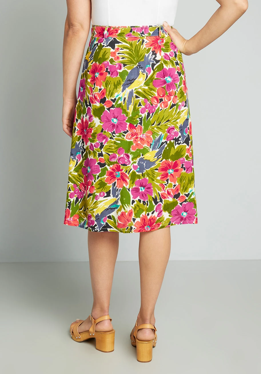 Covered throughout in a menagerie of tropical flowers in vibrant shades of pink and purple, blooming amidst lush greenery, this high-waisted midi skirt from UK brand Pretty Vacant is pure vacay vibe. Made from a soft, woven viscose, this breezy A-line skirt features a matching sash tie-belt, thoughtfully placed pleats at the front waist, hidden side pockets, and an elegant mid-length.