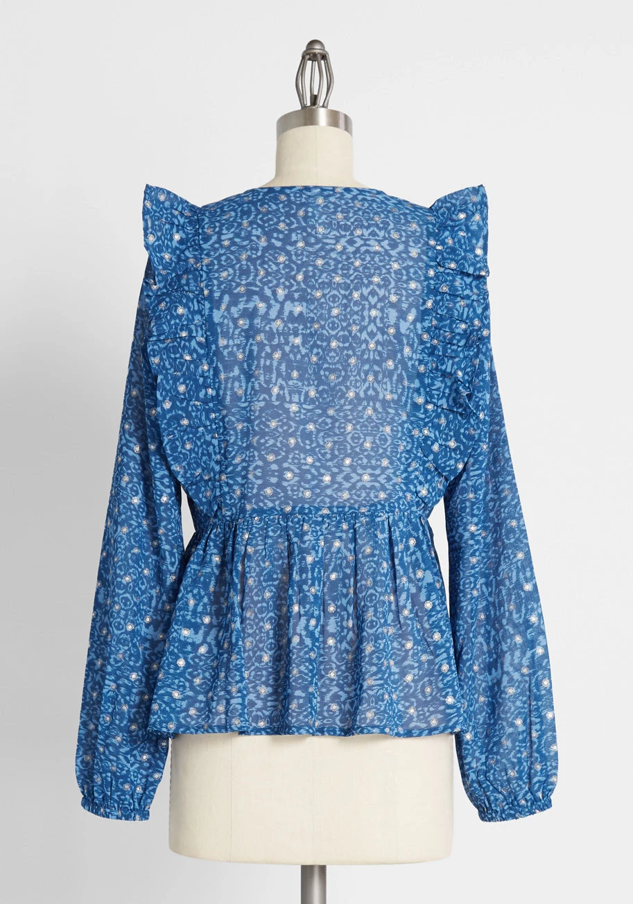Flattering structure and effortless ease make this blue printed top your latest capsule crush. Made of a flowing, breathable fabric, this blouse features a ruffle that trims each shoulder and a peplum that swings around the hips.