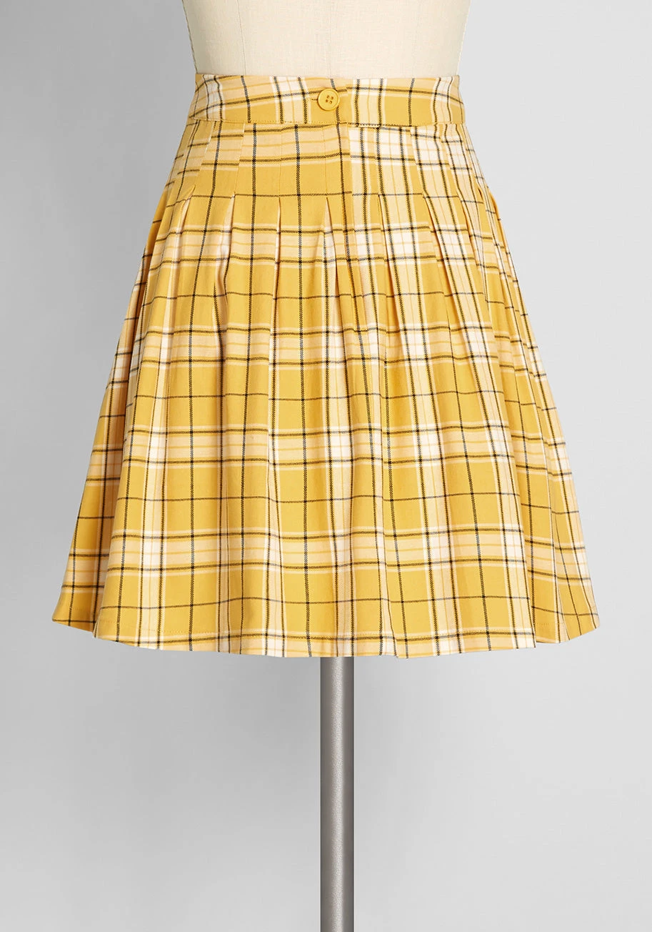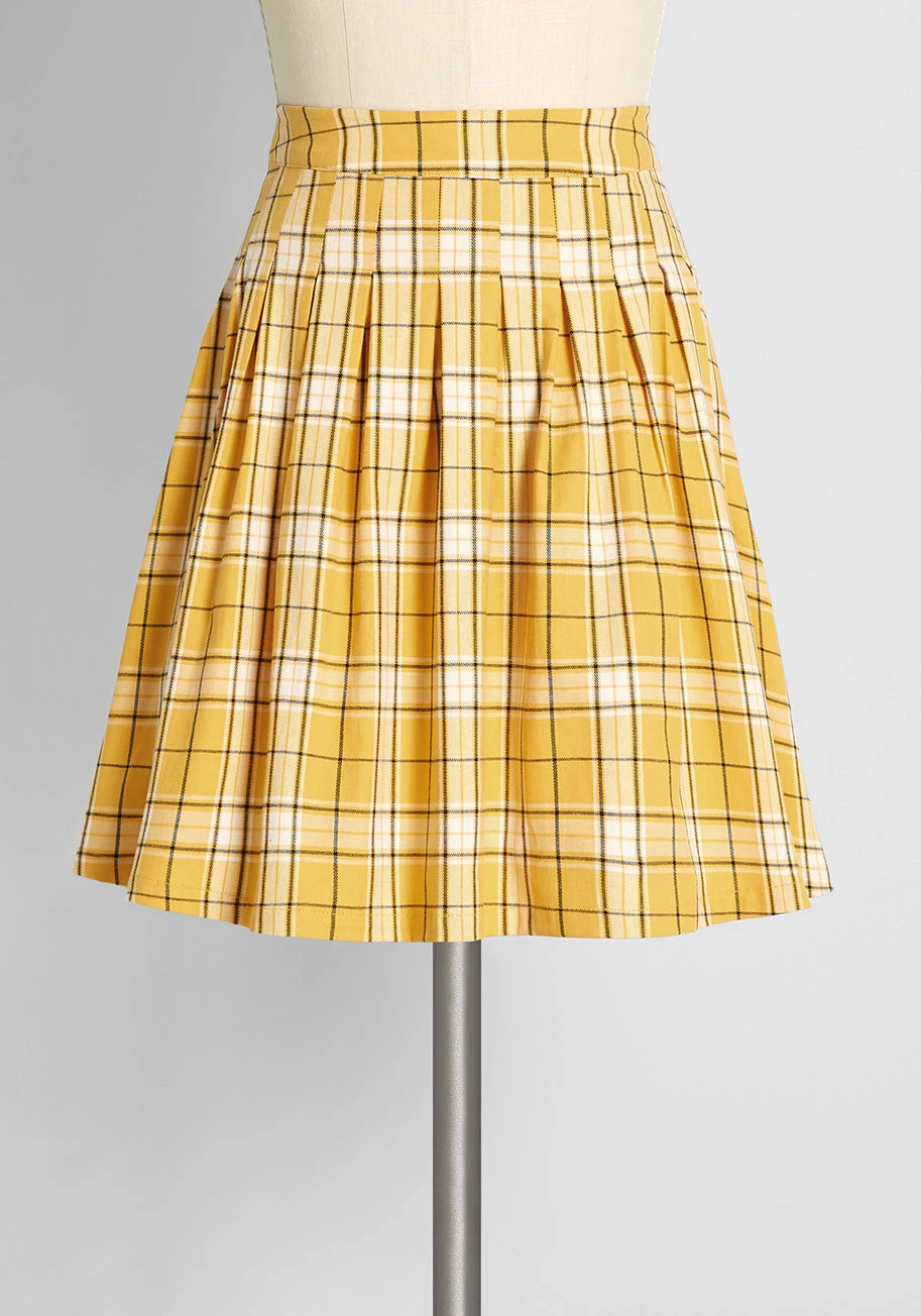 Once the sunshine hits you in this 90’s-inspired pleated mini skirt you won’t be able to resist giving yourself a twirl! Made from a stretchy cotton weave with a golden yellow and ivory tartan print, this darling plaid mini skirt boasts a vintage-inspired high-rise waist and perfectly pleated detailing throughout.