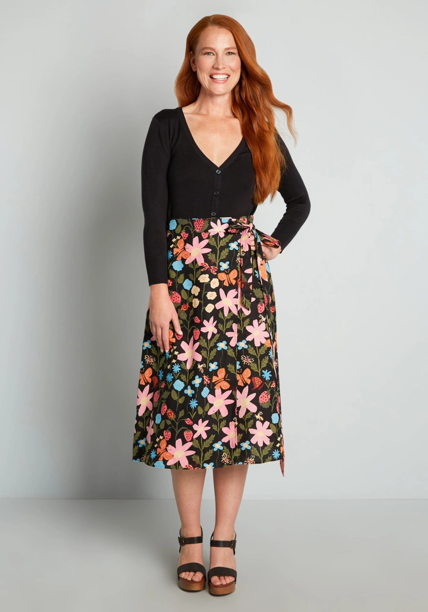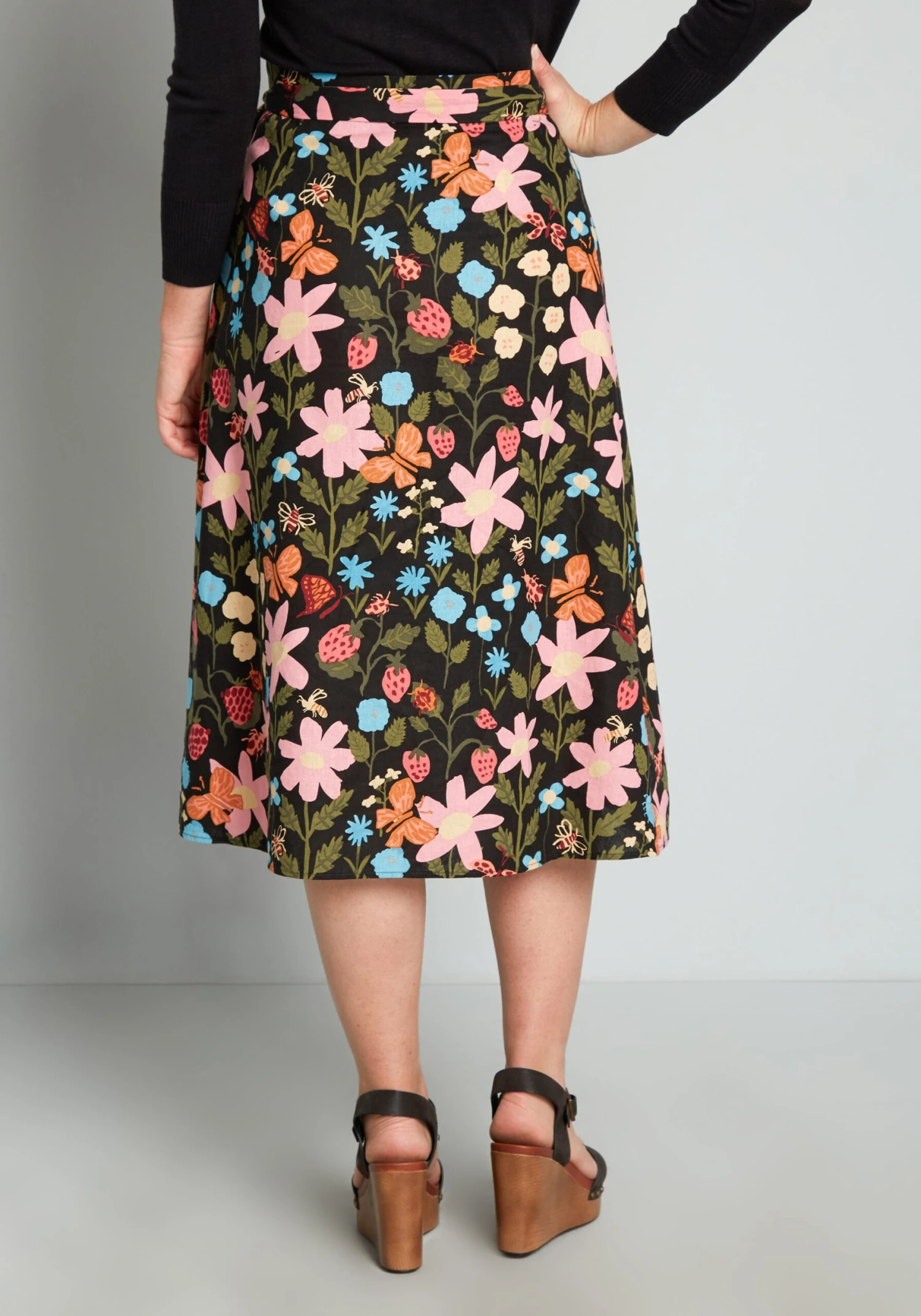 Inspired by vintage spring florals, this black wrap skirt from Aussie brand Princess HIghway features an abundant burst of blooms in shades of pink and blue surrounded by lush greenery, blossoming strawberries, and a variety of cute creatures buzzing throughout. Made from a soft linen-cotton weave, this retro-chic midi skirt boasts a high-rise waistline with adjustable tie-belt closure at the hip, and a stylish A-line silhouette.